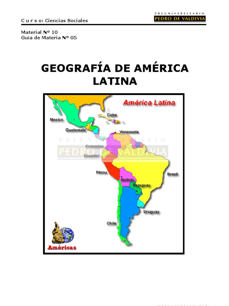 GEOGRAFIA DE AMRICA LATINA Como zona geogrfica, el trmino Amrica Latina se refiere hoy a todo el continente americano al sur del Ro Grande, incluyendo Mxico, Amrica Central, el Caribe y Sudamrica, tierras que fueron colonizadas, a partir del siglo XV por potencias europeas, tales como Espaa, Francia y Portugal. ASPECTOS DEL RELIEVE LATINOAMERICANO Mxico: Se presenta como un pas muy accidentado ya que posee elevaciones superiores a 5.500 metros, mesetas externas, grandes depresiones y profundas barrancas. Tres series de cadenas montaosas, con orientacin general de nordeste a sudeste, conforman el principal sistema orogrfico que recibe el nombre de Sierra Madre: al oeste, la cordillera Sierra Madre Occidental, con un promedio de altitud de 2.250 metros genrico al este, la Sierra Madre Oriental, con 2.220 metros; y, finalmente, la Sierra Madre del Sur, con 2.000 metros de altitud media. La zona de tierras altas forma la denominada " altiplanicie mexicana ", que comprende casi el 40% de la superficie continental del pas. Geolgicamente, esta parte de Mxico est unida a EE.UU. lo que se manifiesta ntidamente en el norte, donde las dos sierras -Sierra Madre Occidental y Sierra Madre Oriental- encierran una gran meseta central, continuando las estructuras del relieve del Oeste de Estados Unidos. Amrica Central: Se extiende entre el Istmo de Tehuantepec y el Golfo de Darin (Ro Atrato). En trminos geolgicos, Amrica Central est asentada sobre la placa del Caribe, cuyo lmite opuesto es el arco de las islas Antillas. Es una regin montaosa y una de las zonas del continente americano con mayor nmero de volcanes activos. El relieve asciende desde la estrecha regin costera del ocano Pacfico a las crestas de las montaas y desciende gradualmente a una vasta regin que se extiende a lo largo del mar Caribe. El Caribe: Constituye un archipilago localizado entre los Estados Unidos y la costa norte de Amrica del Sur y separa el Mar Caribe o de las Antillas del Ocano Atlntico. Las Indias Occidentales comprenden cuatro archipilagos. Estos grupos de islas son las Bahamas, Turcas y Caicos, las Antillas Mayores, las Antillas Menores y las islas del Caribe Sur. Debido a razones histricas, culturales y socioeconmicas, al grupo de islas se le unen frecuentemente algunos pases continentales: como Belice y las Guayanas. El trmino Antillas excluye a las Bahamas y los pases continentales; es decir, solamente se incluyen las islas que rodean directamente el Mar Caribe y que forman un arco que se extienden en forma de media luna desde la punta oriental de la pennsula del Yucatn (en Mxico) y el sureste de Florida (en Estados Unidos) hasta la costa de Venezuela, en Sudamrica. Las secciones occidental y norte componen las Antillas Mayores y comprenden las islas (con sus islas adyacentes): Cuba, Jamaica, La Espaola (con 2 pases: Hait y Repblica Dominicana) y Puerto Rico. Las Antillas Mayores descansan sobre un macizo submarino comn y estn atravesadas por una cadena abrupta y elevada de montaas, cuyos picos ms altos oscilan entre dos y tres mil metros que culminan en La Espaola. Esas montaas estn compuestas de piedra caliza, con afloramiento de otras rocas, todas ellas mucho ms antiguas que las de origen eruptivo de las Antillas Menores. Desde Puerto Rico, hacia el este y luego hacia el sur en forma de arco, hasta la desembocadura del ro Orinoco, se encuentran la cadena de islas que componen las Antillas Menores. La nomenclatura de estos grupos de islas es confusa; destacando las Islas Vrgenes hasta Guadalupe. El grupo de Barlovento incluye Dominica, Martinica, Santa Luca, San Vicente, las Granadinas y Grenada. La regin se presenta con gran riesgo ssmico debido a la existencia de encuentro de placas tectnicas y el devastador terremoto de Hait de Enero de 2010 demuestra que la zona no est preparada para resistir eventos de tal naturaleza. La Cordillera de los Andes. Cordillera reciente de fines de la era secundaria y comienzos del terciario originada por procesos de plegamientos y tectonismo. Maciza, alta, la primera del mundo en longitud, aproximadamente 9.000 Kms, con ancho medio de 250 Kms, con mximos cercanos a los 1.000 Kms. en la regin de los altiplanos. Presenta una gran diversidad de paisajes a lo largo de su recorrido. Los Andes dominan el paisaje geogrfico de todo el sector occidental, acumula las nieves, contiene gran cantidad y variedad de recursos mineros; distribuye las aguas del subcontinente, origina con su altura climas azonales, adems de servir de biombo climtico y de frontera natural. A lo largo de su extensin se distinguen los siguientes sectores: