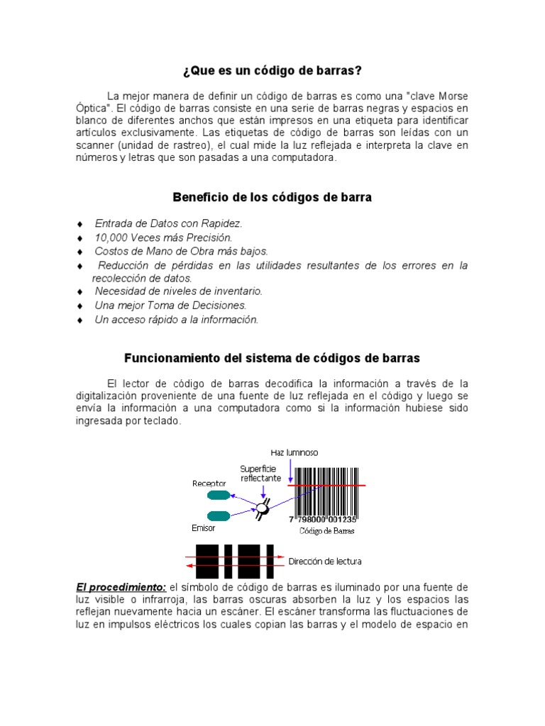 La mejor manera de definir un cdigo de barras es como una "clave Morse ptica". El cdigo de barras consiste en una serie de barras negras y espacios en blanco de diferentes anchos que estn impresos en una etiqueta para identificar artculos exclusivamente. Las etiquetas de cdigo de barras son ledas con un scanner (unidad de rastreo), el cual mide la luz reflejada e interpreta la clave en nmeros y letras que son pasadas a una computadora.