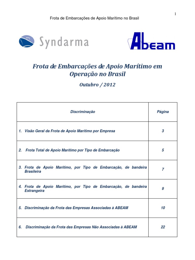 O presente relatrio retrata o perfil da frota de Apoio Martimo no Brasil, posio de Outubro de 2012. Os dados foram obtidos junto a ANTAQ, DPC, publicaes especializadas e informaes das empresas. As embarcaes encontram-se discriminadas por empresa, por tipo / classe e por bandeira (brasileira ou estrangeira). Para efeito de registro, no foram consideradas embarcaes com porte inferior a 100 TPB e BHP inferior a 1.000, alm das embarcaes de menor porte caracterizadas como lanchas. Cabe tambm registrar que conceituamos como empresa, o grupo empresarial como um todo. Significa dizer que para efeito de caracterizao de empresa associada ABEAM, por exemplo, basta que apenas uma filial do grupo empresarial esteja associada.