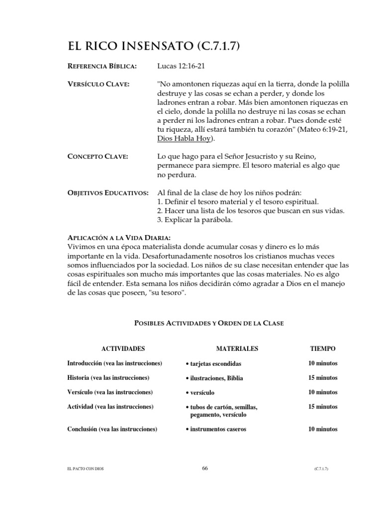REFERENCIA BBLICA: VERSCULO CLAVE: Lucas 12:16-21 "No amontonen riquezas aqu en la tierra, donde la polilla destruye y las cosas se echan a perder, y donde los ladrones entran a robar. Ms bien amontonen riquezas en el cielo, donde la polilla no destruye ni las cosas se echan a perder ni los ladrones entran a robar. Pues donde est tu riqueza, all estar tambin tu corazn" (Mateo 6:19-21, Dios Habla Hoy). Lo que hago para el Seor Jesucristo y su Reino, permanece para siempre. El tesoro material es algo que no perdura. Al final de la clase de hoy los nios podrn: 1. Definir el tesoro material y el tesoro espiritual. 2. Hacer una lista de los tesoros que buscan en sus vidas. 3. Explicar la parbola.