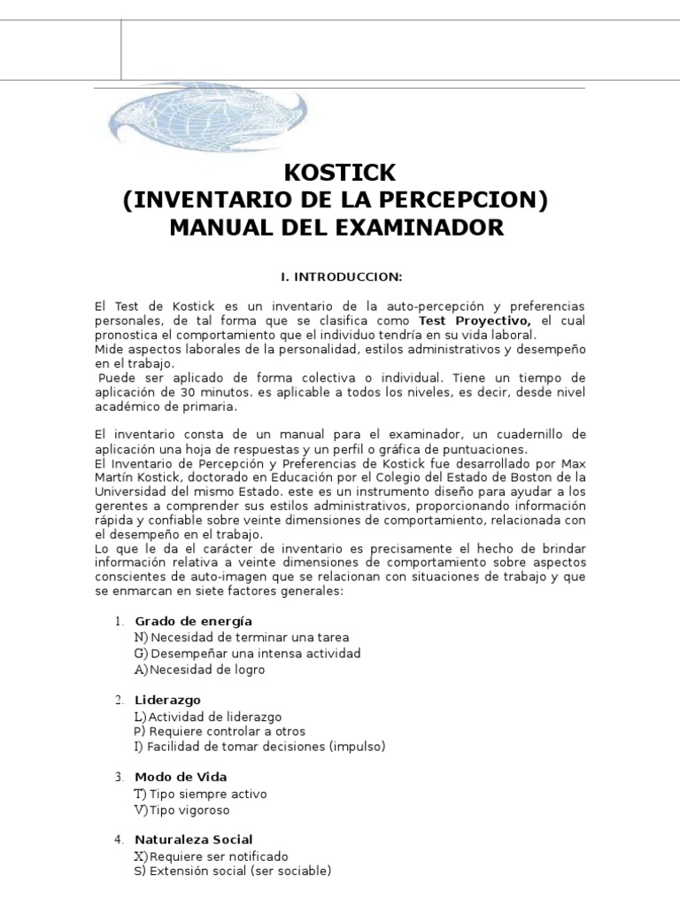 I. INTRODUCCION: El Test de Kostick es un inventario de la auto-percepcin y preferencias personales, de tal forma que se clasifica como Test Proyectivo, el cual pronostica el comportamiento que el individuo tendra en su vida laboral. Mide aspectos laborales de la personalidad, estilos administrativos y desempeo en el trabajo. Puede ser aplicado de forma colectiva o individual. Tiene un tiempo de aplicacin de 30 minutos. es aplicable a todos los niveles, es decir, desde nivel acadmico de primaria. El inventario consta de un manual para el examinador, un cuadernillo de aplicacin una hoja de respuestas y un perfil o grfica de puntuaciones. El Inventario de Percepcin y Preferencias de Kostick fue desarrollado por Max Martn Kostick, doctorado en Educacin por el Colegio del Estado de Boston de la Universidad del mismo Estado. este es un instrumento diseo para ayudar a los gerentes a comprender sus estilos administrativos, proporcionando informacin rpida y confiable sobre veinte dimensiones de comportamiento, relacionada con el desempeo en el trabajo. Lo que le da el carcter de inventario es precisamente el hecho de brindar informacin relativa a veinte dimensiones de comportamiento sobre aspectos conscientes de auto-imagen que se relacionan con situaciones de trabajo y que se enmarcan en siete factores generales: