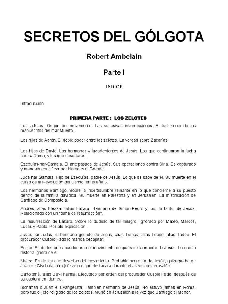 Introduccin PRIMERA PARTE : LOS ZELOTES Los zelotes. Origen del movimiento. Las sucesivas insurrecciones. El testimonio de los manuscritos del mar Muerto. Los hijos de Aarn. El doble poder entre los zelotes. La verdad sobre Zacaras. Los hijos de David. Los hermanos y lugartenientes de Jess. Los que continuaron la lucha contra Roma, y los que desertaron. Ezequas-har-Gamala. El antepasado de Jess. Sus operaciones contra Siria. Es capturado y mandado crucificar por Herodes el Grande. Juda-har-Gamala. Hijo de Ezequas, padre de Jess. Lo que se sabe de l. Su muerte en el curso de la Revolucin del Censo, en el ao 6. Los hermanos Santiago. Sobre la incertidumbre reinante en lo que concierne a su puesto dentro de la familia davdica. Su muerte en Palestina y en Jerusaln. La mistificacin de Santiago de Compostela. Andrs, alias Eleazar, alias Lzaro. Hermano de Simn-Pedro y, por lo tanto, de Jess. Relacionado con un "tema de resurreccin". La resurreccin de Lzaro. Sobre lo dudoso de tal milagro, ignorado por Mateo, Marcos, Lucas y Pablo. Posible explicacin. Judas-bar-Judas, el hermano gemelo de Jess, alias Toms, alias Lebeo, alias Tadeo. El procurador Cuspio Fado lo manda decapitar. Felipe. Es de los que abandonaron el movimiento despus de la muerte de Jess. Lo que la historia ignora de l. Mateo. Es de los que desertan del movimiento. Probablemente to de Jess, quiz padre de Juan de Gischala, otro jefe zelote que destacar durante el asedio de Jerusaln. Bartolom, alias Bar-Thalmai. Ejecutado por orden del procurador Cuspio Fado, despus de su captura en Idumea. Iochanan o Juan el Evangelista. Tambin hermano de Jess. No estuvo jams en Roma, pero fue el jefe religioso de los zelotes. Muri en Jerusaln a la vez que Santiago el Menor.