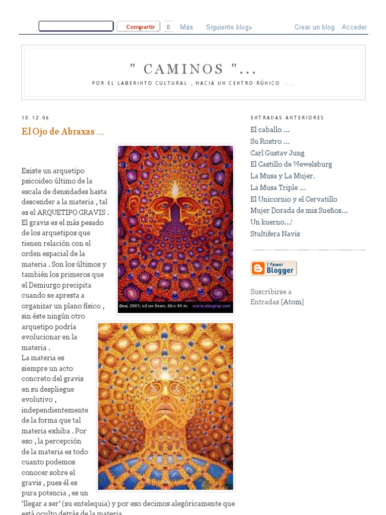 medir , pesar , etc. , habr una suma de propiedades arquetpicas que determinarn las diferencias , pero cuando nos referimos al grav is las cosas cambian , pues y a no se distingue la entelequia de uno y otro objeto , diremos : son indiscernibles ...... Si los puntos indiscernibles son todos uno y la misma cosa cmo pueden estar en distintos cuerpos a la v ez ? . Si el punto indiscernible o entelequia de la Tierra es ex actamente el mismo que el de V enus , por ejemplo , cmo es que millones de kilmetros separan a ambos planetas ? : la respuesta es : la distancia que sepoara a los planetas no tiene nada que v er con los puntos indiscernibles pues ninguna distancia los separa en todo instante de su entelequia . Naturalmente , muchos reirn al or esto , y mejor as si no estn preparados para afrontar el misterio de "May a" , pues muchos han enloquecido ante la realidad de los puntos indiscernibles ; son los msticos los que de pronto v ieron OJOS en todas partes , o los que por medio de drogas han ex perimentado tan terrible realidad .............. Desde la entelequia de los grav is , desde los puntos indiscernibles que estn en todos los cuerpos , es decir , desde el tiempo que es Su Conciencia , est El sosteniendo el orden material . Pero El no acta a trav s de los grav is , solamente los sostiene . No es el aspecto Logos el que se manifiesta en los puntos indiscernibles sino el aspecto Conciencia (tiempo) . No es el Verbo sino el Ojo del Demiurgo . Un Ojo multiplicado infinitamente en toda la creacin pero que es siempre el mismo Ojo : he all a May a . Un Ojo que se contempla a s mismo , que se admira perpetuamente a s mismo . Un Ojo que est en el lobo que acecha y en el cordero que huy e , en el hombre que hunde el pual en su hermano y en el hermano que muere , y tambin en el pual que se embriaga de sangre borboteante . Un Ojo que mira desde el amado y desde la amada y desde la traicin del tercero . En fin , ese Ojo cuy a cuenca es una sima que desciende a los abismos del bien y del mal , es el OJO DE A BRA XA S , un Ojo terrible e insensato . No en v ano los Gnsticos alejandrinos , que saban con que clase de monstruo se las tenan que v er , encerraban al ojo de A brax as en un tringulo , es decir , aplicaban la "ley del cerco" , para no enloquecer de esquizofrenia . Los iniciados Hiperbreos , como los iniciados SS y como aquellos Gnsticos , tambin poseen tcnicas para resistir la mirada disolv ente del Demiurgo y aprov echar los puntos indiscernibles de los arquetipos grav is ...................... Pero eso es motiv o para otra charla . Conceptos de Felipe Moy ano . Pinturas de A lex Grey .