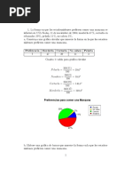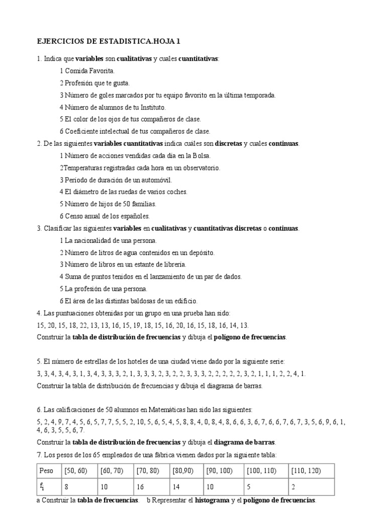 1. Indica que variables son cualitativas y cuales cuantitativas: 1 Comida Favorita. 2 Profesin que te gusta. 3 Nmero de goles marcados por tu equipo favorito en la ltima temporada. 4 Nmero de alumnos de tu Instituto. 5 El color de los ojos de tus compaeros de clase. 6 Coeficiente intelectual de tus compaeros de clase. 2. De las siguientes variables cuantitativas indica cules son discretas y cuales continuas. 1 Nmero de acciones vendidas cada da en la Bolsa. 2Temperaturas registradas cada hora en un observatorio. 3 Perodo de duracin de un automvil. 4 El dimetro de las ruedas de varios coches. 5 Nmero de hijos de 50 familias. 6 Censo anual de los espaoles. 3. Clasificar las siguientes variables en cualitativas y cuantitativas discretas o continuas. 1 La nacionalidad de una persona. 2 Nmero de litros de agua contenidos en un depsito. 3 Nmero de libros en un estante de librera. 4 Suma de puntos tenidos en el lanzamiento de un par de dados. 5 La profesin de una persona. 6 El rea de las distintas baldosas de un edificio. 4. Las puntuaciones obtenidas por un grupo en una prueba han sido: 15, 20, 15, 18, 22, 13, 13, 16, 15, 19, 18, 15, 16, 20, 16, 15, 18, 16, 14, 13. Construir la tabla de distribucin de frecuencias y dibuja el polgono de frecuencias. 5. El nmero de estrellas de los hoteles de una ciudad viene dado por la siguiente serie: 3, 3, 4, 3, 4, 3, 1, 3, 4, 3, 3, 3, 2, 1, 3, 3, 3, 2, 3, 2, 2, 3, 3, 3, 2, 2, 2, 2, 2, 3, 2, 1, 1, 1, 2, 2, 4, 1. Construir la tabla de distribucin de frecuencias y dibuja el diagrama de barras. 6. Las calificaciones de 50 alumnos en Matemticas han sido las siguientes: 5, 2, 4, 9, 7, 4, 5, 6, 5, 7, 7, 5, 5, 2, 10, 5, 6, 5, 4, 5, 8, 8, 4, 0, 8, 4, 8, 6, 6, 3, 6, 7, 6, 6, 7, 6, 7, 3, 5, 6, 9, 6, 1, 4, 6, 3, 5, 5, 6, 7. Construir la tabla de distribucin de frecuencias y dibuja el diagrama de barras.