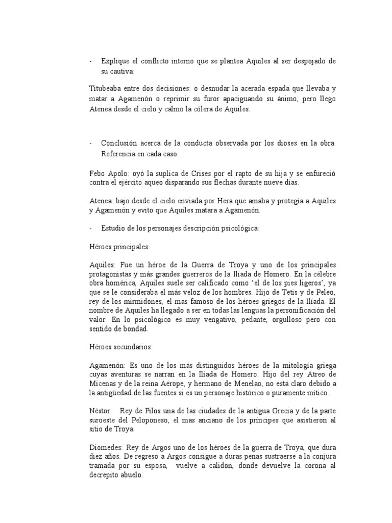 Aquiles, pues era semidis por que era hijo de Peleo, un rey mortal y de Tetis, una diosa del mar. Un semidis era mortal, (al igual que Hrcules por ejemplo, o Perseo) si embargo Tetis quiso hacer a su hijo inmortal y para ello la diosa Hera Juno le orden sumergir a su hijo en el fuego divino, lo cual hizo Tetis, tomando a su hijo Aquiles de uno de sus talones, todo l fue inmortalizado, menos del taln del que fue agarrado por su madre, es decir que su taln era su nica parte mortal, por lo que muri por un flechazo de no se quin, que le di en el taln, por lo que se desangr y muri. - Capitulo iv: -Persona en que estn narrados los hechos: Los hechos estn narrados en tres personas. -Determine si el narrador se encuentra dentro o fuera dl relato: Fuera de los hechos, el cuenta lo que ve, lo que sucede a otros, figura como espectador. -Observe las frases o adjetivos (eptetos) que se presentan ntimamente en la obra: -Aquiles: el de los pies ligeros .