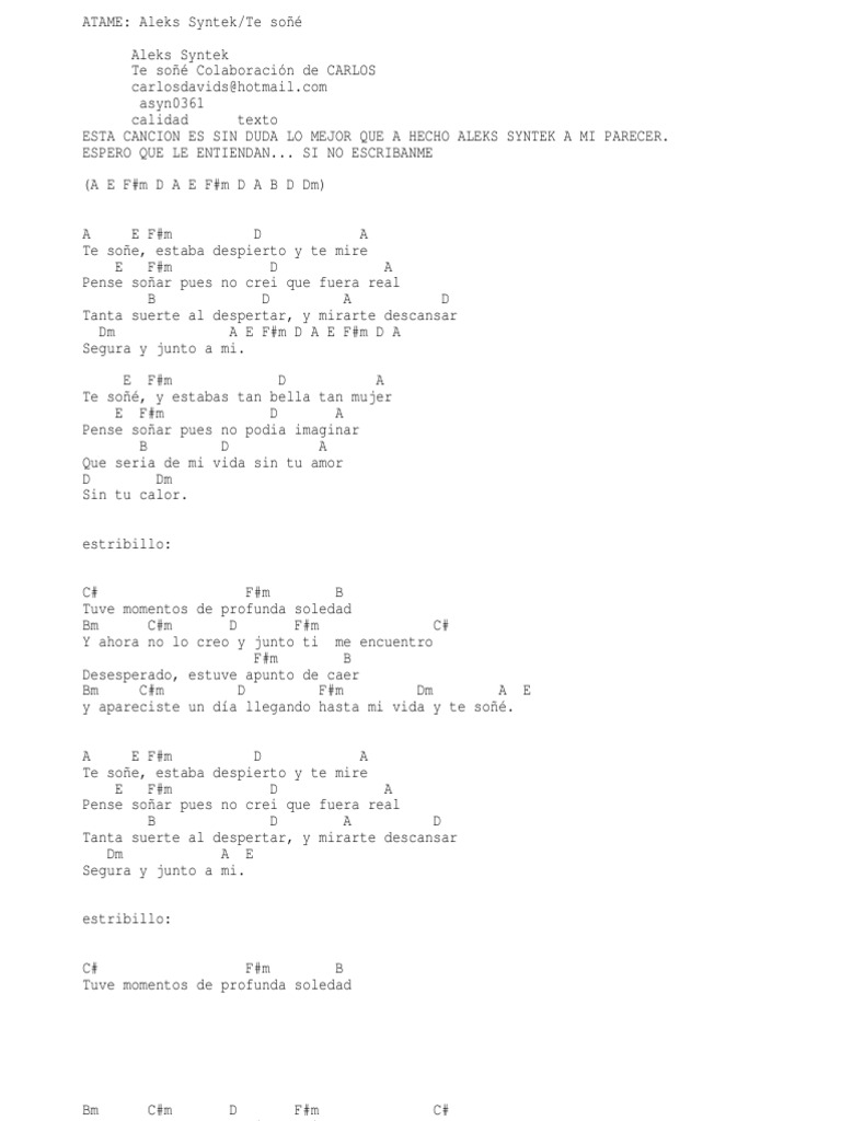 com asyn0361 calidad texto ESTA CANCION ES SIN DUDA LO MEJOR QUE A HECHO ALEKS SYNTEK A MI PARECER. ESPERO QUE LE ENTIENDAN... SI NO ESCRIBANME (A E F#m D A E F#m D A B D Dm) A E F#m D A Te soe, estaba despierto y te mire E F#m D A Pense soar pues no crei que fuera real B D A D Tanta suerte al despertar, y mirarte descansar Dm A E F#m D A E F#m D A Segura y junto a mi. E F#m D A Te so, y estabas tan bella tan mujer E F#m D A Pense soar pues no podia imaginar B D A Que seria de mi vida sin tu amor D Dm Sin tu calor. estribillo: C# F#m B Tuve momentos de profunda soledad Bm C#m D F#m C# Y ahora no lo creo y junto ti me encuentro F#m B Desesperado, estuve apunto de caer Bm C#m D F#m Dm A E y apareciste un da llegando hasta mi vida y te so. A E F#m D A Te soe, estaba despierto y te mire E F#m D A Pense soar pues no crei que fuera real B D A D Tanta suerte al despertar, y mirarte descansar Dm A E Segura y junto a mi. estribillo: C# F#m B Tuve momentos de profunda soledad