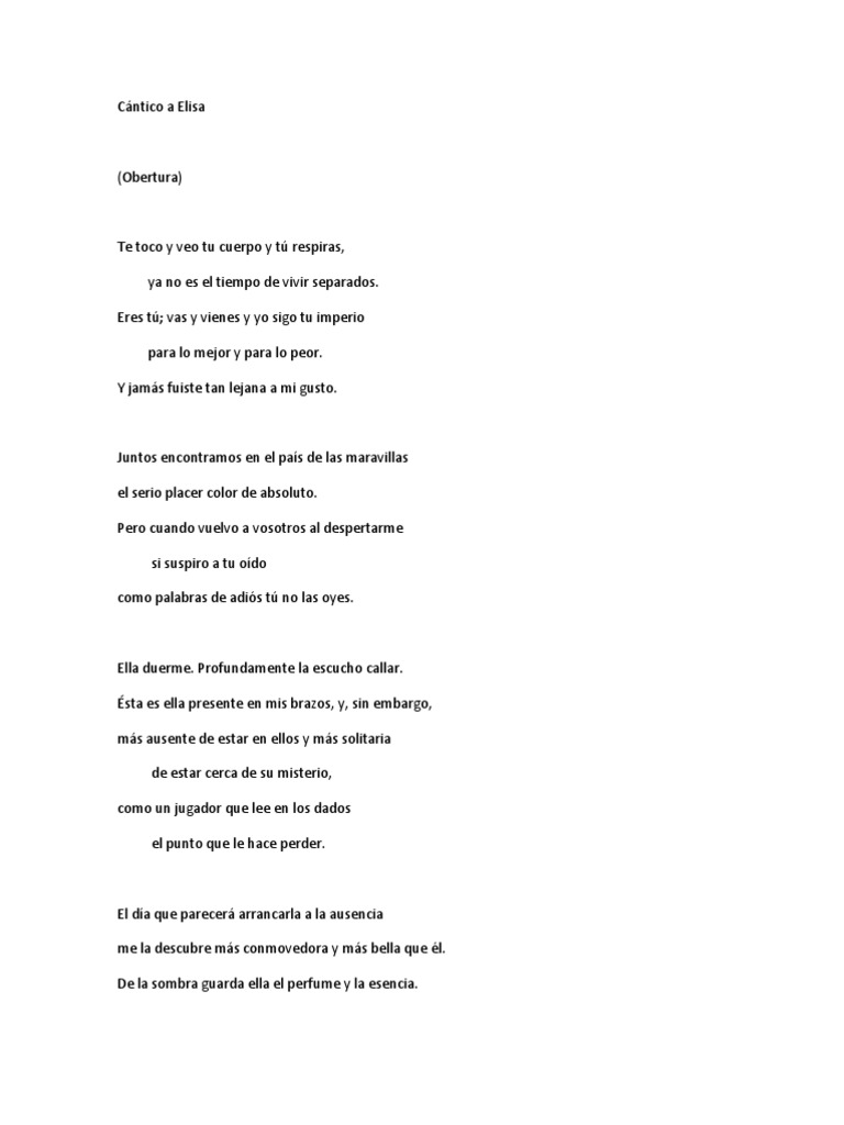Ella duerme. Profundamente la escucho callar. sta es ella presente en mis brazos, y, sin embargo, ms ausente de estar en ellos y ms solitaria de estar cerca de su misterio, como un jugador que lee en los dados el punto que le hace perder.