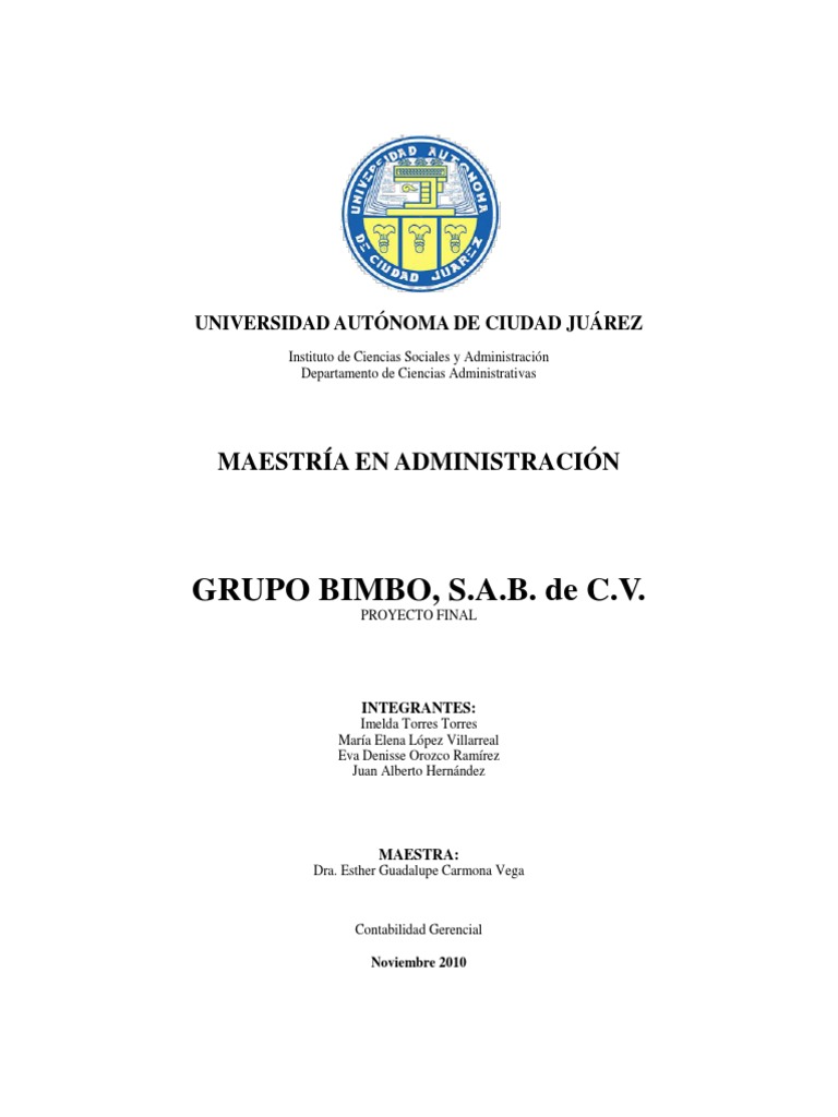 GARRISON & Noreen. Managerial Accounting . Twelve Edition. Mc Graw Hill. 2008. RAMREZ, Padilla, David Noel . Contabilidad Administrativa . Octava edicin. McGraw Hill. 2008. INEGI. (2010, Septiembre). Retrieved Noviembre 25, 2010, from INEGI: http://www.inegi.gob.mx/inegi/contenidos/espanol/ciberhabitat/fabrica/textos/texto_pan.htm Grupo Bimbo, S.A.B. de C.V. Informe Anual 2009. Mxico, Distrito Federal, Mxico. 2010 Grupo Bimbo, S.A.B. de C.V. Reporte Anual 2008. Mxico, Distrito Federal, Mxico. 2009