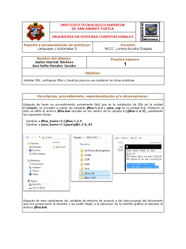 Despus de hacer un procedimiento sumamente fcil que es la instalacin de JDK en la unidad C:\Java\, se procedi a copiar las carpetas jflex-1.4.3 y java_cup en la unidad C:\. Posterior a esto se edit el archivo jflex.bat ubicado en bin dentro de la carpeta C:\jflex-1.4.3\, cambiando las siguientes lneas. Cambiar a jflex_home=C:\jflex-1.4.3 Cambiar a java_home=C:\java\jdk1.7.0_07