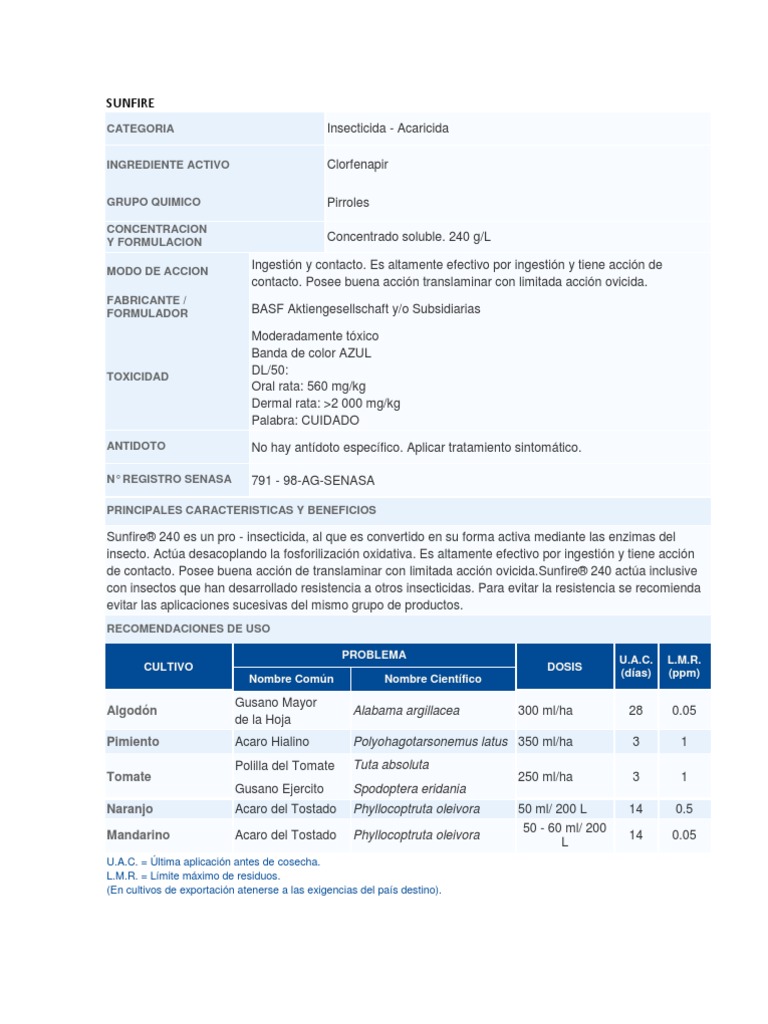 Insecticida - Acaricida Clorfenapir Pirroles Concentrado soluble. 240 g/L Ingestin y contacto. Es altamente efectivo por ingestin y tiene accin de contacto. Posee buena accin translaminar con limitada accin ovicida. BASF Aktiengesellschaft y/o Subsidiarias Moderadamente txico Banda de color AZUL DL/50: Oral rata: 560 mg/kg Dermal rata: >2 000 mg/kg Palabra: CUIDADO No hay antdoto especfico. Aplicar tratamiento sintomtico. 791 - 98-AG-SENASA