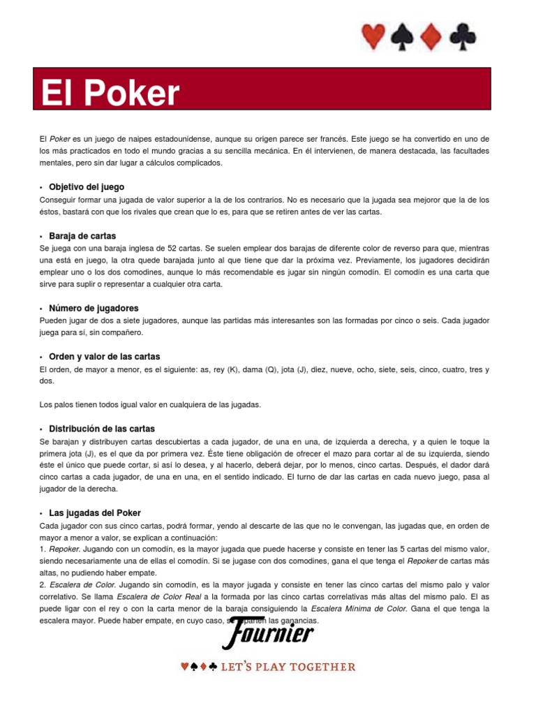 El Poker es un juego de naipes estadounidense, aunque su origen parece ser francs. Este juego se ha convertido en uno de los ms practicados en todo el mundo gracias a su sencilla mecnica. En l intervienen, de manera destacada, las facultades mentales, pero sin dar lugar a clculos complicados. Objetivo del juego Conseguir formar una jugada de valor superior a la de los contrarios. No es necesario que la jugada sea mejoror que la de los stos, bastar con que los rivales que crean que lo es, para que se retiren antes de ver las cartas. Baraja de cartas Se juega con una baraja inglesa de 52 cartas. Se suelen emplear dos barajas de diferente color de reverso para que, mientras una est en juego, la otra quede barajada junto al que tiene que dar la prxima vez. Previamente, los jugadores decidirn emplear uno o los dos comodines, aunque lo ms recomendable es jugar sin ningn comodn. El comodn es una carta que sirve para suplir o representar a cualquier otra carta. Nmero de jugadores Pueden jugar de dos a siete jugadores, aunque las partidas ms interesantes son las formadas por cinco o seis. Cada jugador juega para s, sin compaero. Orden y valor de las cartas El orden, de mayor a menor, es el siguiente: as, rey (K), dama (Q), jota (J), diez, nueve, ocho, siete, seis, cinco, cuatro, tres y dos. Los palos tienen todos igual valor en cualquiera de las jugadas. Distribucin de las cartas Se barajan y distribuyen cartas descubiertas a cada jugador, de una en una, de izquierda a derecha, y a quien le toque la primera jota (J), es el que da por primera vez. ste tiene obligacin de ofrecer el mazo para cortar al de su izquierda, siendo ste el nico que puede cortar, si as lo desea, y al hacerlo, deber dejar, por lo menos, cinco cartas. Despus, el dador dar cinco cartas a cada jugador, de una en una, en el sentido indicado. El turno de dar las cartas en cada nuevo juego, pasa al jugador de la derecha. Las jugadas del Poker Cada jugador con sus cinco cartas, podr formar, yendo al descarte de las que no le convengan, las jugadas que, en orden de mayor a menor a valor, se explican a continuacin: 1. Repoker. Jugando con un comodn, es la mayor jugada que puede hacerse y consiste en tener las 5 cartas del mismo valor, siendo necesariamente una de ellas el comodn. Si se jugase con dos comodines, gana el que tenga el Repoker de cartas ms altas, no pudiendo haber empate. 2. Escalera de Color. Jugando sin comodn, es la mayor jugada y consiste en tener las cinco cartas del mismo palo y valor correlativo. Se llama Escalera de Color Real a la formada por las cinco cartas correlativas ms altas del mismo palo. El as puede ligar con el rey o con la carta menor de la baraja consiguiendo la Escalera Mnima de Color. Gana el que tenga la escalera mayor. Puede haber empate, en cuyo caso, se reparten las ganancias.