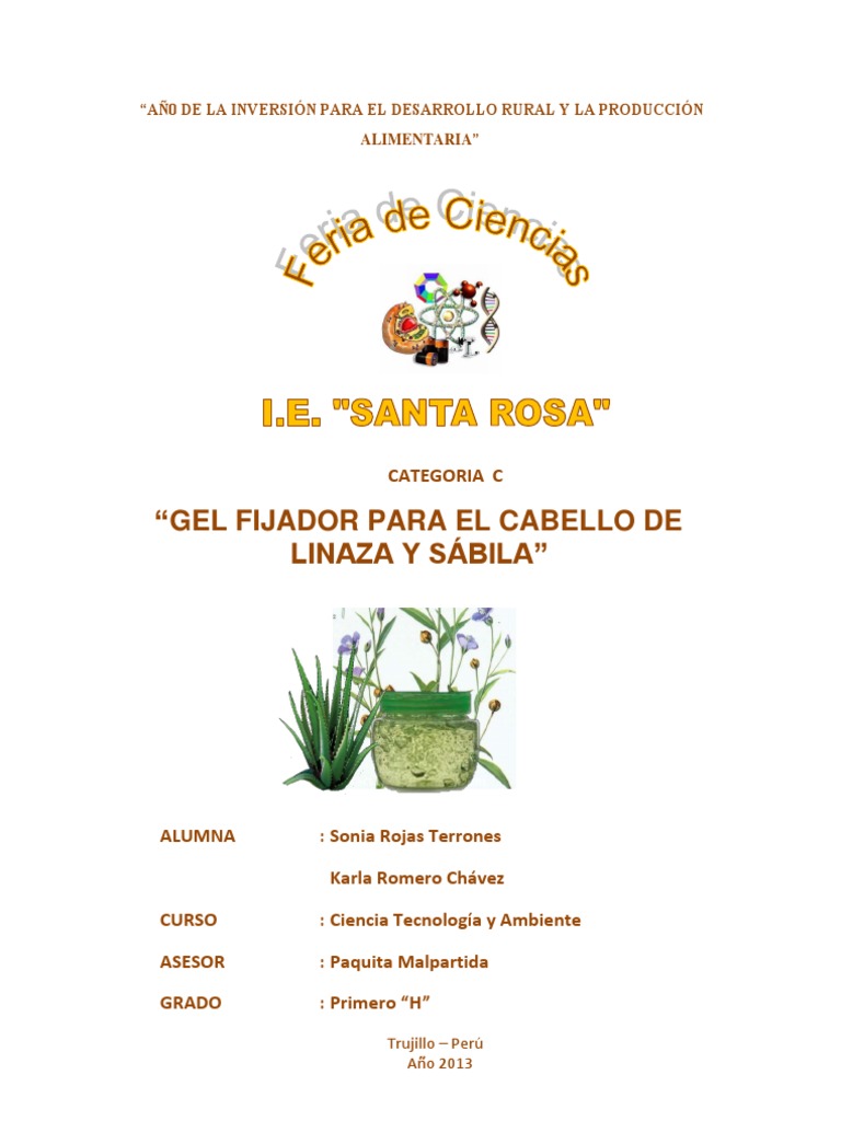 RESUMEN El presente estudio: GEL FIJADOR PARA EL CABELLO, DE LINAZA Y SBILA tuvo como finalidad realizar un gel fijador para el cabello a base de ingredientes naturales, los cuales son la Sbila y las Semillas de Linaza.