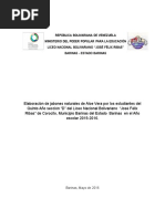 CAPTULO III: MATERIALES Y MTODOS 3.1 Tcnicas e instrumentos de recoleccin de datos. Las tcnicas que se utilizaron en la verificacin del problema planteado consisti en la utilizacin de cuatro instrumentos los cuales fueron: principalmente se utiliz la observacin directa en el cual se observ el hecho de identificar ciertos componentes que se iban a utilizar en la realizacin del producto de igual manera que las consecuencias que traa el someter dichos componentes a varios procedimientos. Por medio de entrevistas cara a cara con los tutores, padres y algunos alumnos. Tambin lo que fue el resumen de texto y revisin bibliogrfica en la cual se consult informacin terica que llevara a la realizacin o establecimiento de la teora de la investigacin. y por ltimo, los recursos institucionales en el cual se visit varias instalaciones (centros dermatolgicos) para as obtener opiniones y recomendaciones de los especialistas en el tema a tratar. 3.2 Materiales usados: Un recipiente de vidrio, boca ancha 300ml de agua 75gm de linaza Un trozo pequeo de Sbila. Colorante vegetal