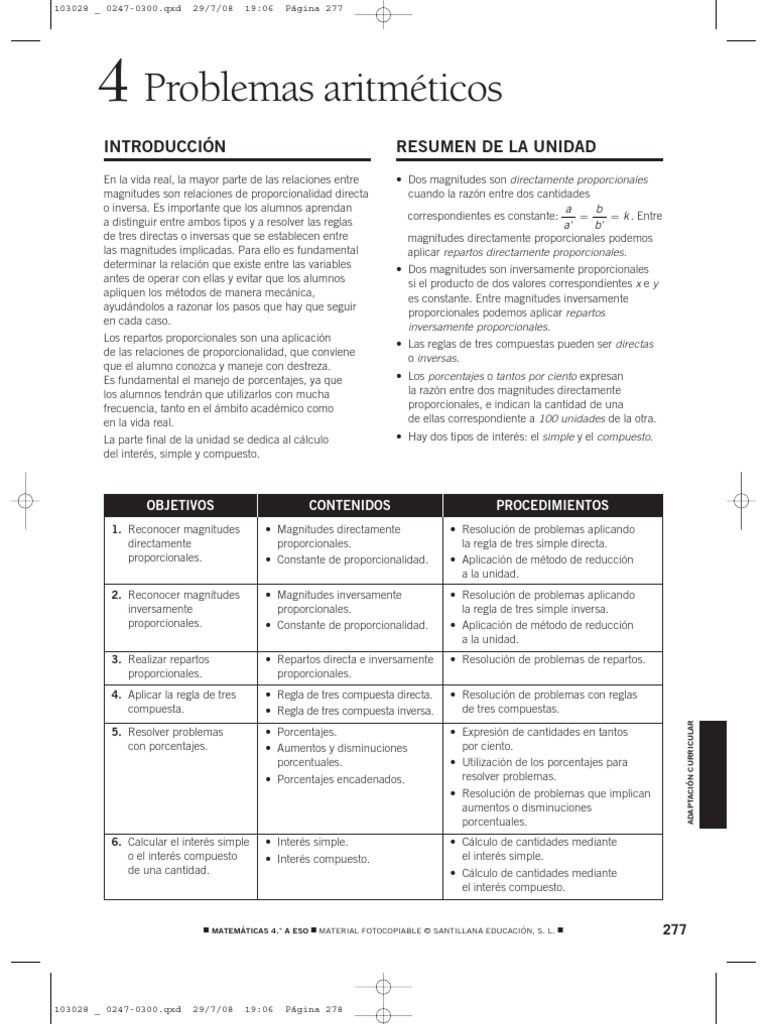 En la vida real, la mayor parte de las relaciones entre magnitudes son relaciones de proporcionalidad directa o inversa. Es importante que los alumnos aprendan a distinguir entre ambos tipos y a resolver las reglas de tres directas o inversas que se establecen entre las magnitudes implicadas. Para ello es fundamental determinar la relacin que existe entre las variables antes de operar con ellas y evitar que los alumnos apliquen los mtodos de manera mecnica, ayudndolos a razonar los pasos que hay que seguir en cada caso. Los repartos proporcionales son una aplicacin de las relaciones de proporcionalidad, que conviene que el alumno conozca y maneje con destreza. Es fundamental el manejo de porcentajes, ya que los alumnos tendrn que utilizarlos con mucha frecuencia, tanto en el mbito acadmico como en la vida real. La parte final de la unidad se dedica al clculo del inters, simple y compuesto.