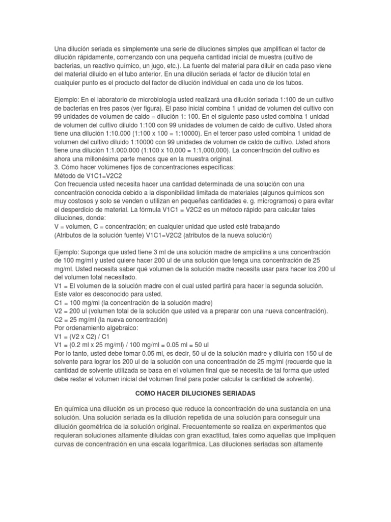 una pequea cantidad inicial de muestra (cultivo de bacterias, un reactivo qumico, un jugo, etc.). La fuente del material para diluir en cada paso viene del material diluido en el tubo anterior. En una dilucin seriada el factor de dilucin total en cualquier punto es el producto del factor de dilucin individual en cada uno de los tubos. Ejemplo: En el laboratorio de microbiologa usted realizar una dilucin seriada 1:100 de un cultivo de bacterias en tres pasos (ver figura). El paso inicial combina 1 unidad de volumen del cultivo con 99 unidades de volumen de caldo = dilucin 1: 100. En el siguiente paso usted combina 1 unidad de volumen del cultivo diluido 1:100 con 99 unidades de volumen de caldo de cultivo. Usted ahora tiene una dilucin 1:10.000 (1:100 x 100 = 1:10000). En el tercer paso usted combina 1 unidad de volumen del cultivo diluido 1:10000 con 99 unidades de volumen de caldo de cultivo. Usted ahora tiene una dilucin 1:1.000.000 (1:100 x 10,000 = 1:1,000,000). La concentracin del cultivo es ahora una millonsima parte menos que en la muestra original. 3. Cmo hacer volmenes fijos de concentraciones especficas: Mtodo de V1C1=V2C2 Con frecuencia usted necesita hacer una cantidad determinada de una solucin con una concentracin conocida debido a la disponibilidad limitada de materiales (algunos qumicos son muy costosos y solo se venden o utilizan en pequeas cantidades e. g. microgramos) o para evitar el desperdicio de material. La frmula V1C1 = V2C2 es un mtodo rpido para calcular tales diluciones, donde: V = volumen, C = concentracin; en cualquier unidad que usted est trabajando (Atributos de la solucin fuente) V1C1=V2C2 (atributos de la nueva solucin) Ejemplo: Suponga que usted tiene 3 ml de una solucin madre de ampicilina a una concentracin de 100 mg/ml y usted quiere hacer 200 ul de una solucin que tenga una concentracin de 25 mg/ml. Usted necesita saber qu volumen de la solucin madre necesita usar para hacer los 200 ul del volumen total necesitado. V1 = El volumen de la solucin madre con el cual usted partir para hacer la segunda solucin. Este valor es desconocido para usted. C1 = 100 mg/ml (la concentracin de la solucin madre) V2 = 200 ul (volumen total de la solucin que usted va a preparar con una nueva concentracin). C2 = 25 mg/ml (la nueva concentracin) Por ordenamiento algebraico: V1 = (V2 x C2) / C1 V1 = (0.2 ml x 25 mg/ml) / 100 mg/ml = 0.05 ml = 50 ul Por lo tanto, usted debe tomar 0.05 ml, es decir, 50 ul de la solucin madre y diluirla con 150 ul de solvente para lograr los 200 ul de la solucin con una concentracin de 25 mg/ml (recuerde que la cantidad de solvente utilizada se basa en el volumen final que se necesita de tal forma que usted debe restar el volumen inicial del volumen final para poder calcular la cantidad de solvente). COMO HACER DILUCIONES SERIADAS