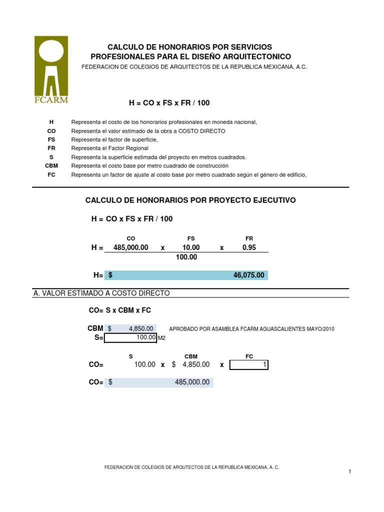 H CO FS FR S CBM FC Representa el costo de los honorarios profesionales en moneda nacional, Representa el valor estimado de la obra a COSTO DIRECTO Representa el factor de superficie, Representa el Factor Regional Representa la superficie estimada del proyecto en metros cuadrados. Representa el costo base por metro cuadrado de construccin Representa un factor de ajuste al costo base por metro cuadrado segn el gnero de edificio,