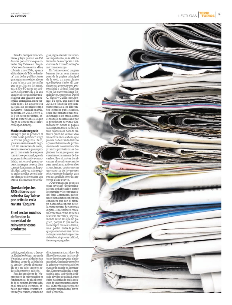 gas, sigue siendo un recurso importante, ms all de frmulas de suscripcin o iniciativas de crowdfunding o micromecenazgo. En nmerocero, un gran banner de cerveza danesa preside la pgina principal de la web, un anunciante que lleg por s solo. Si consigues un proyecto con personalidad y tirn al final son ellos los que terminan llamndote, comentan David G. Natal y Guillermo Arenas. Su web, que naci en 2011, se financia por completo gracias a los diferentes ingresos publicitarios, sean en formatos ms tradicionales o en otros, como el trabajo desarrollado por la productora de vdeo Numerocero. Sobre el pago a los colaboradores, se muestran tajantes a la hora de criticar a quien no lo hace: No nos entra en la cabeza que pueda haber tanto listillo aprovechndose de profesionales de la comunicacin y tantos profesionales dejndose hacer porque no encuentran otra manera de hacerlo. Eso s, antes de alcanzar el nombre necesario para resultar atractivos a los anunciantes, contaron con un soporte de inversores relativamente holgado para ser autosuficientes durante ese plazo previo. Qu panorama espera a estas revistas? Predominar esta cohabitacin entre lo gratuito y lo remunerado? Jordi Corominas, que conoce bien ambos contextos, considera que con el tiempo habr una especie de seleccin natural periodstica digital. En el futuro cercano veremos cmo muchas revistas cierran y, seguramente sern las que no paguen, porque lo que contar siempre ms es la firma, no el portal. Entre la gente que puede tener una carrera impera un hartazgo considerable; si quieres calidad, tienes que pagarla.