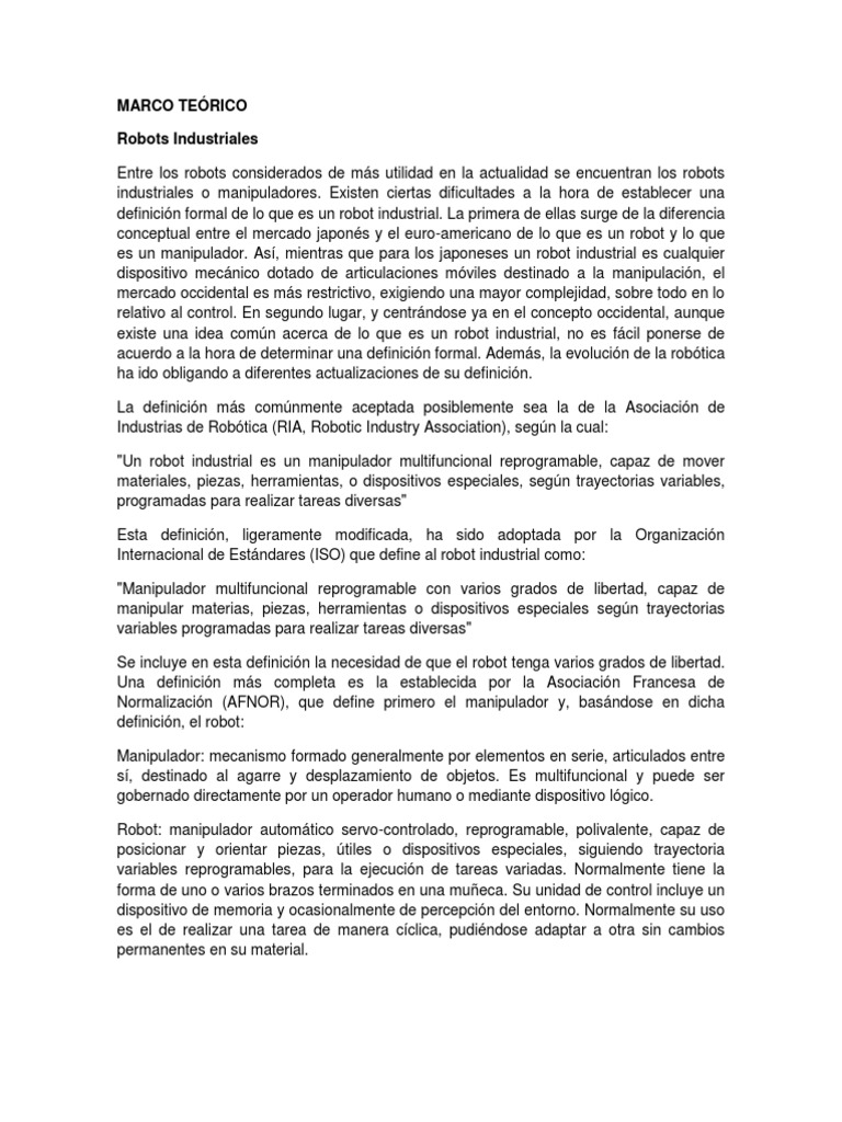 MARCO TERICO Robots Industriales Entre los robots considerados de ms utilidad en la actualidad se encuentran los robots industriales o manipuladores.