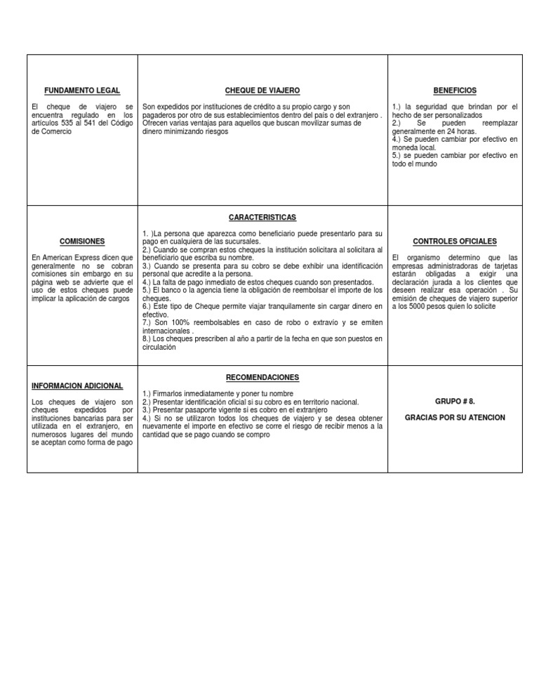 CARACTERISTICAS 1. )La persona que aparezca como beneficiario puede presentarlo para su pago en cualquiera de las sucursales. 2.) Cuando se compran estos cheques la institucin solicitara al solicitara al beneficiario que escriba su nombre. 3.) Cuando se presenta para su cobro se debe exhibir una identificacin personal que acredite a la persona. 4.) La falta de pago inmediato de estos cheques cuando son presentados. 5.) El banco o la agencia tiene la obligacin de reembolsar el importe de los cheques. 6.) Este tipo de Cheque permite viajar tranquilamente sin cargar dinero en efectivo. 7.) Son 100% reembolsables en caso de robo o extravo y se emiten internacionales . 8.) Los cheques prescriben al ao a partir de la fecha en que son puestos en circulacin