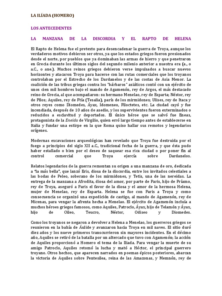 LA ILADA (HOMERO) Pramo a que, pagado el rescate de redencin, reciba a su hijo. Se llevan a cabo estas gestiones doce das despus de la muerte de Hctor. Pramo, durante la noche, al igual que Hcuba y todos los dems troyanos, renen preciosos dones y cargan con ellos un carro conducido por el pregonero Ideo y manda que se prepare otro. Entonces hechas las libaciones y aceptado el augurio directo, comienzan a recorrer el camino. Hermes llega ante Pramo por mandato de Zeus, y lo lleva a la tienda, sirvindole de viga durante el tiempo dedicado al sueo. Aquiles, vencido fcilmente por las splicas del rey, recibe el precio de la redencin, le devuelve el cuerpo lavado, envuelto en tnicas y concede once das de tregua para la sepultura y ofrecindole honrosa cena lo manda a descansar. Al amanecer del da siguiente, conducindolos Hermes, Pramo lleva el cuerpo a la ciudad a cuya vista salieron todos los troyanos con grandes lamentos; colocado poco despus en palacio, despus de haberse presentado los cantores, lloran Andrmaca, Hcuba y Helena. Hecha despus la pira, se celebra el funeral y el banquete. Personajes La cantidad de personajes que circulan a lo largo de la obra es considerablemente grande por lo cual he seleccionado solo a aquellos que considero de importancia ms relevante, divididos en los dos bandos. He optado por prescindir de los dioses pese a su gran importancia argumental y centrarme ms en los hombres y mujeres que vivieron la guerra. Bando griego Aquiles: El mayor de los guerreros griegos en la guerra de Troya. Era hijo de la ninfa del mar, Tetis, y de Peleo, rey de los mirmidones de Tesalia. Aquiles libr muchas batallas durante el sitio de diez aos a la ciudad de Troya. Cuando el prncipe troyano Hctor mat a Patroclo, el desconsolado Aquiles volvi a la batalla, mat a Hctor y arrastr su cuerpo triunfante detrs de su carro. Ms tarde permiti a Pramo, rey de Troya, rescatar el cuerpo de Hctor. Agamenn: Rey de Micenas y jefe de las fuerzas griegas en la guerra de Troya. Hijo de Atreo, padeci la maldicin lanzada sobre su casa. Despus de un sitio de diez aos, cay Troya y Agamenn volvi victorioso a Micenas. Menelao: Rey de Esparta, hermano de Agamenn, rey de Micenas, y marido de Helena de Troya. Cuando el prncipe troyano Paris rapt a Helena, Menelao organiz una expedicin para rescatarla. Bajo el mando de Agamenn, Menelao y los dems reyes griegos zarparon hacia Troya.