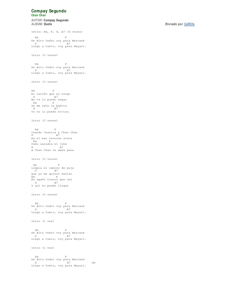 Chan Chan AUTOR: Compay Segundo ALBUM: Duets Intro: Dm, F, G, A7 (4 veces) Dm F De Alto Cedro voy para Marcan G A7 Llego a Cueto, voy para Mayar. Intro (3 veces) Dm F De Alto Cedro voy para Marcan G A7 Llego a Cueto, voy para Mayar. Intro (3 veces) Dm F El cario que te tengo G A7 No te lo puedo negar Dm F Se me sale la babita G A7 Yo no lo puedo evitar. Intro (3 veces) Dm F Cuando Juanica y Chan Chan G A7 En el mar cernan arena Dm F Como sacuda el jibe G A7 A Chan Chan le daba pena Intro (3 veces) Dm F Limpia el camino de paja G A7 Que yo me quiero sentar Dm F En aqul tronco que veo G A7 Y as no puedo llegar Intro (3 veces) Dm F De Alto Cedro voy para Marcan G A7 Llego a Cueto, voy para Mayar. Intro (1 vez) Dm F De Alto Cedro voy para Marcan G A7 Llego a Cueto, voy para Mayar. Intro (1 vez) Dm F De Alto Cedro voy para Marcan G A7 Llego a Cueto, voy para Mayar. Enviado por CaRlOs