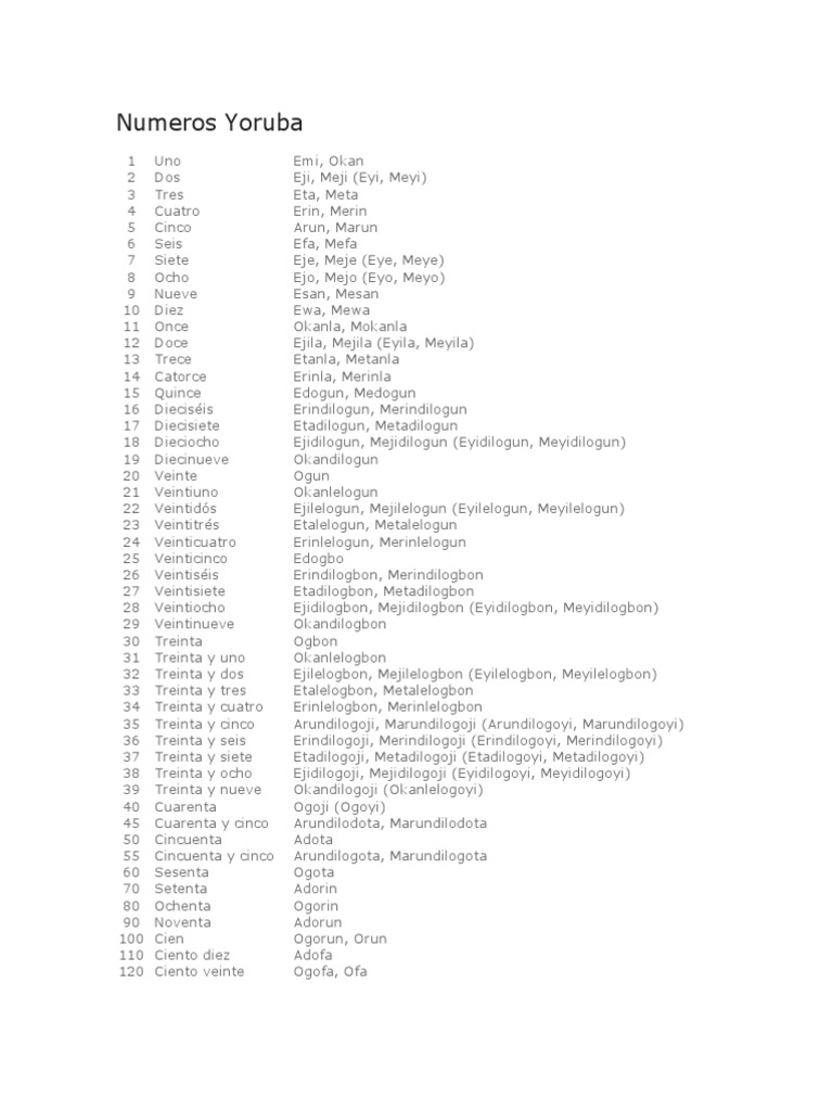 1 2 3 4 5 6 7 8 9 10 11 12 13 14 15 16 17 18 19 20 21 22 23 24 25 26 27 28 29 30 31 32 33 34 35 36 37 38 39 40 45 50 55 60 70 80 90 100 110 120 Uno Dos Tres Cuatro Cinco Seis Siete Ocho Nueve Diez Once Doce Trece Catorce Quince Diecisis Diecisiete Dieciocho Diecinueve Veinte Veintiuno Veintids Veintitrs Veinticuatro Veinticinco Veintisis Veintisiete Veintiocho Veintinueve Treinta Treinta y uno Treinta y dos Treinta y tres Treinta y cuatro Treinta y cinco Treinta y seis Treinta y siete Treinta y ocho Treinta y nueve Cuarenta Cuarenta y cinco Cincuenta Cincuenta y cinco Sesenta Setenta Ochenta Noventa Cien Ciento diez Ciento veinte Emi, Okan Eji, Meji (Eyi, Meyi) Eta, Meta Erin, Merin Arun, Marun Efa, Mefa Eje, Meje (Eye, Meye) Ejo, Mejo (Eyo, Meyo) Esan, Mesan Ewa, Mewa Okanla, Mokanla Ejila, Mejila (Eyila, Meyila) Etanla, Metanla Erinla, Merinla Edogun, Medogun Erindilogun, Merindilogun Etadilogun, Metadilogun Ejidilogun, Mejidilogun (Eyidilogun, Meyidilogun) Okandilogun Ogun Okanlelogun Ejilelogun, Mejilelogun (Eyilelogun, Meyilelogun) Etalelogun, Metalelogun Erinlelogun, Merinlelogun Edogbo Erindilogbon, Merindilogbon Etadilogbon, Metadilogbon Ejidilogbon, Mejidilogbon (Eyidilogbon, Meyidilogbon) Okandilogbon Ogbon Okanlelogbon Ejilelogbon, Mejilelogbon (Eyilelogbon, Meyilelogbon) Etalelogbon, Metalelogbon Erinlelogbon, Merinlelogbon Arundilogoji, Marundilogoji (Arundilogoyi, Marundilogoyi) Erindilogoji, Merindilogoji (Erindilogoyi, Merindilogoyi) Etadilogoji, Metadilogoji (Etadilogoyi, Metadilogoyi) Ejidilogoji, Mejidilogoji (Eyidilogoyi, Meyidilogoyi) Okandilogoji (Okanlelogoyi) Ogoji (Ogoyi) Arundilodota, Marundilodota Adota Arundilogota, Marundilogota Ogota Adorin Ogorin Adorun Ogorun, Orun Adofa Ogofa, Ofa