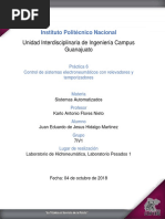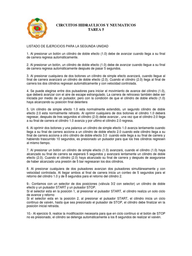LISTADO DE EJERCICIOS PARA LA SEGUNDA UNIDAD 1. Al presionar un botn un cilindro de doble efecto (1.0) debe de avanzar cuando llega a su final de carrera regresa automticamente. 2. Al presionar un botn, un cilindro de doble efecto (1.0) debe de avanzar cuando llegue a su final de carrera regresa automticamente despus de pasar 5 segundos. 3. Al presionar cualquiera de dos botones un cilindro de simple efecto avanzar, cuando llegue al final de carrera avanzar un cilindro de doble efecto (2.0). Cuando el cilindro (2.0) llega al final de carrera los dos cilindros regresan automticamente y con velocidad controlada. 4. Se puede elegirse entre dos pulsadores para iniciar el movimiento de avance del cilindro (1.0), que deber avanzar con el aire de escape estrangulado. La carrera de retroceso tambin debe ser iniciada por medio de un pulsador, pero con la condicin de que el cilindro de doble efecto (1.0) haya alcanzando su posicin final delantera 5. Un cilindro de simple efecto 1.0 esta normalmente extendido, un segundo cilindro de doble efecto 2.0 esta normalmente retrado. Al oprimir cualquiera de dos botones el cilindro 1.0 deber regresar, despus de tres segundos el cilindro (2.0) debe avanzar., una vez que el cilindro 2.0 llega a su final de carrera el cilindro 1.0 avanza y por ultimo el cilindro 2.0 regresa. 6. Al oprimir dos botones y una palanca un cilindro de simple efecto 1.0 avanza lentamente cuando llega a su final de carrera acciona a un cilindro de doble efecto 2.0 cuando este cilindro llega a su final de carrera acciona a otro cilindro de doble efecto 3.0 cuando este llega a su final de carrera y habiendo trascurrido 10 segundos, es presionado un pulsador para que los tres cilindros regresen al mismo tiempo. 7. Al presionar un botn un cilindro de simple efecto (1.0) avanzar, cuando el cilindro (1.0) haya alcanzado su final de carrera se esperar 5 segundos y avanzar lentamente un cilindro de doble efecto (2.0). Cuando el cilindro (2.0) haya alcanzado su final de carrera y despus de asegurarse de haber alcanzado una presin de 5 bar regresaran los dos cilindros. 8. Al presionar cualquiera de dos pulsadores avanzan dos pulsadores simultneamente y con velocidad controlada. Al llegar ambos al final de carrera inicia un conteo de 5 segundos para el retorno del cilindro 1.0 y de 8 segundos para el retorno del cilindro 2. 9.- Contamos con un selector de dos posiciones (vlvula 3/2 con selector) un cilindro de doble efecto y un pulsador START y un pulsador STOP. Si el selector esta en la posicin 1, al presionar el pulsador START, el cilindro realiza un solo ciclo de avance y retorno Si el selector esta en la posicin 2, al presionar el pulsador START, el cilindro inicia un ciclo continuo de vaivn, hasta que sea presionado el pulsador de STOP, el cilindro debe finalizar en la posicin inicial retrada. 10.- Al ejercicio 9, realice la modificacin necesaria para que en ciclo continuo si el botn de STOP no es presionado, el cilindro se detenga automticamente a los 8 segundos de realizar el vaivn.