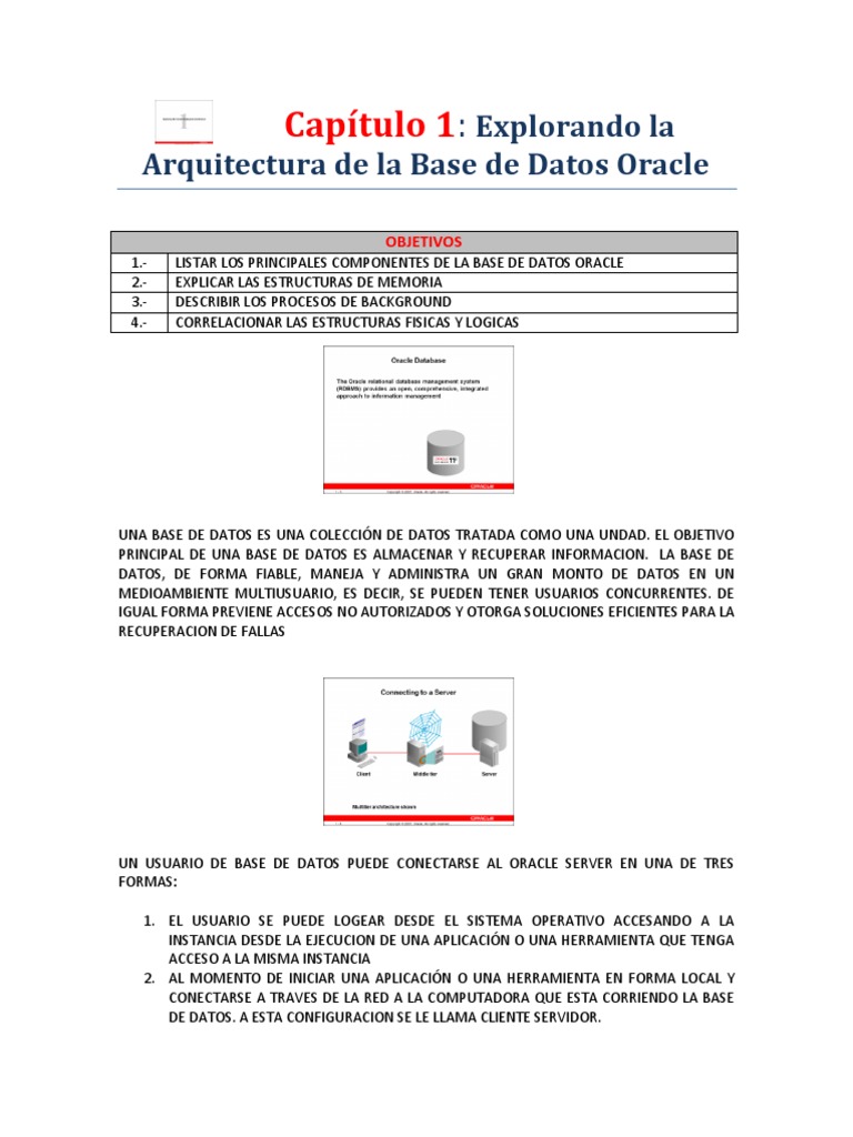 [Link].LISTAR LOS PRINCIPALES COMPONENTES DE LA BASE DE DATOS ORACLE EXPLICAR LAS ESTRUCTURAS DE MEMORIA DESCRIBIR LOS PROCESOS DE BACKGROUND CORRELACIONAR LAS ESTRUCTURAS FISICAS Y LOGICAS