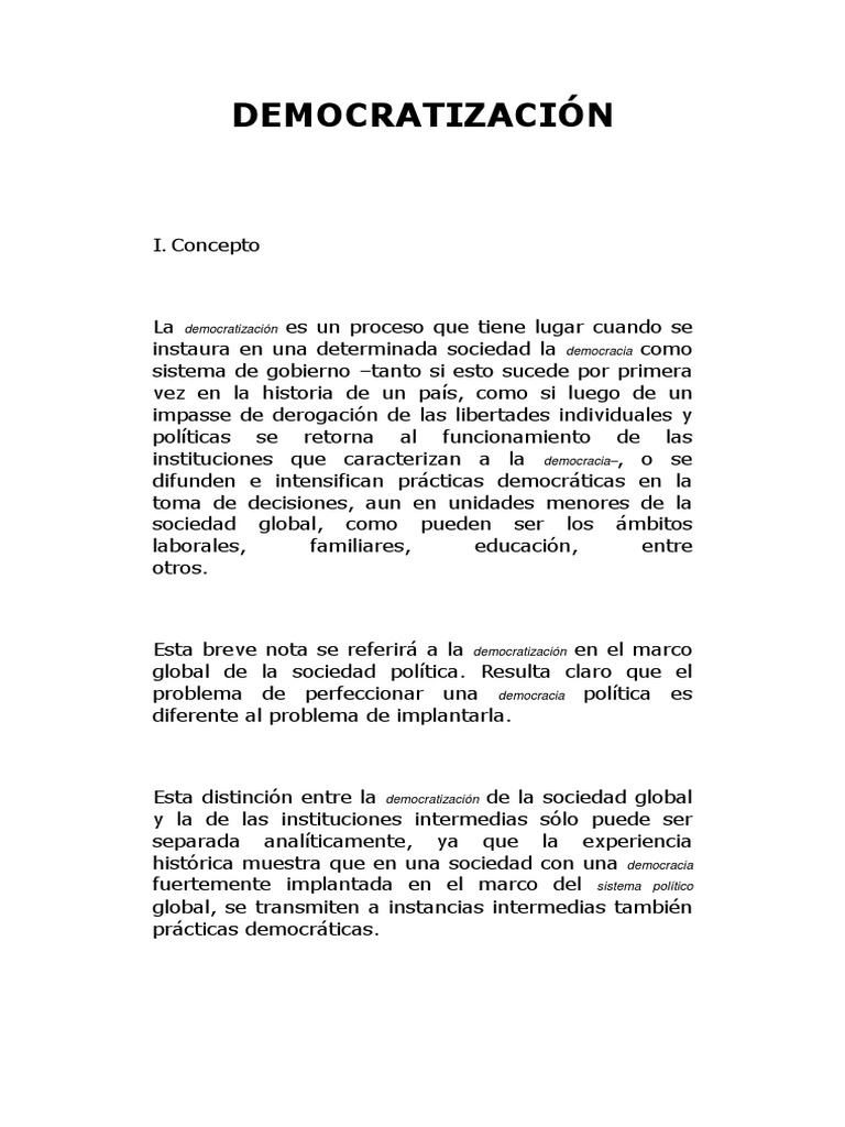 La democratizacin es un proceso que tiene lugar cuando se instaura en una determinada sociedad la democracia como sistema de gobierno tanto si esto sucede por primera vez en la historia de un pas, como si luego de un impasse de derogacin de las libertades individuales y polticas se retorna al funcionamiento de las instituciones que caracterizan a la democracia, o se difunden e intensifican prcticas democrticas en la toma de decisiones, aun en unidades menores de la sociedad global, como pueden ser los mbitos laborales, familiares, educacin, entre otros.