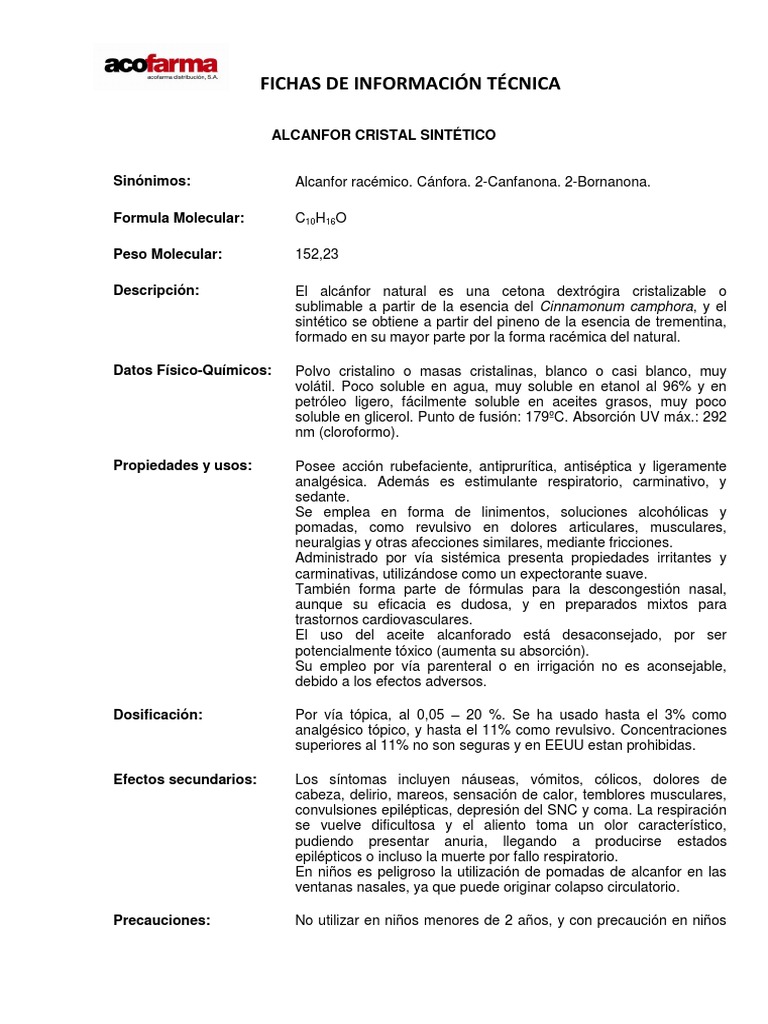Alcanfor racmico. Cnfora. 2-Canfanona. 2-Bornanona. C10H16O 152,23 El alcnfor natural es una cetona dextrgira cristalizable o sublimable a partir de la esencia del Cinnamonum camphora, y el sinttico se obtiene a partir del pineno de la esencia de trementina, formado en su mayor parte por la forma racmica del natural. Polvo cristalino o masas cristalinas, blanco o casi blanco, muy voltil. Poco soluble en agua, muy soluble en etanol al 96% y en petrleo ligero, fcilmente soluble en aceites grasos, muy poco soluble en glicerol. Punto de fusin: 179C. Absorcin UV mx.: 292 nm (cloroformo). Posee accin rubefaciente, antiprurtica, antisptica y ligeramente analgsica. Adems es estimulante respiratorio, carminativo, y sedante. Se emplea en forma de linimentos, soluciones alcohlicas y pomadas, como revulsivo en dolores articulares, musculares, neuralgias y otras afecciones similares, mediante fricciones. Administrado por va sistmica presenta propiedades irritantes y carminativas, utilizndose como un expectorante suave. Tambin forma parte de frmulas para la descongestin nasal, aunque su eficacia es dudosa, y en preparados mixtos para trastornos cardiovasculares. El uso del aceite alcanforado est desaconsejado, por ser potencialmente txico (aumenta su absorcin). Su empleo por va parenteral o en irrigacin no es aconsejable, debido a los efectos adversos. Por va tpica, al 0,05 20 %. Se ha usado hasta el 3% como analgsico tpico, y hasta el 11% como revulsivo. Concentraciones superiores al 11% no son seguras y en EEUU estan prohibidas. Los sntomas incluyen nuseas, vmitos, clicos, dolores de cabeza, delirio, mareos, sensacin de calor, temblores musculares, convulsiones epilpticas, depresin del SNC y coma. La respiracin se vuelve dificultosa y el aliento toma un olor caracterstico, pudiendo presentar anuria, llegando a producirse estados epilpticos o incluso la muerte por fallo respiratorio. En nios es peligroso la utilizacin de pomadas de alcanfor en las ventanas nasales, ya que puede originar colapso circulatorio. No utilizar en nios menores de 2 aos, y con precaucin en nios