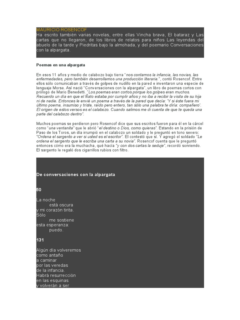 Poemas en una alpargata En esos 11 aos y medio de calabozo bajo tierra nos contamos la infancia, las novias, las enfermedades, pero tambin desarrollamos una produccin literaria. , cont Rosencof. Entre ellos slo comunicaban a travs de golpes de nudillo en la pared e inventaron una especie de lenguaje Morse. As naci Conversaciones con la alpargata, un libro de poemas cortos con prlogo de Mario Benedetti. Los poemas eran cortos porque los golpes eran muchos. Recuerdo un da en que el ato estaba por cumplir aos y no iba a recibir la visita de su hija ni de nadie. Entonces le envi un poema a travs de la pared que deca: 'Y si ste fuera mi ltimo poema, insumiso y triste, rado pero entero, tan slo una palabra te dira: compaero '. El origen de estos versos es el calabozo. Cuando salimos me di cuenta de que te queda una parte del calabozo dentro. Muchos poemas se perdieron pero Rosencof dice que sus escritos fueron para l en la crcel como una ventanita que le abri el destino o Dios, como quieras. Estando en la prisin de Paso de los Toros, un da irrumpi en el calabozo un soldado y le pregunt en tono severo: Ordena el sargento a ver si usted es el escritor. El contest que s. Y agreg el soldado Le ordena el sargento que le escriba una carta a su novia. Rosencof cuenta que le pregunt entonces cmo era la muchacha, qu haca y con dos cartas la seduje, record sonriendo. El sargento le regal dos cigarrillos rubios con filtro.