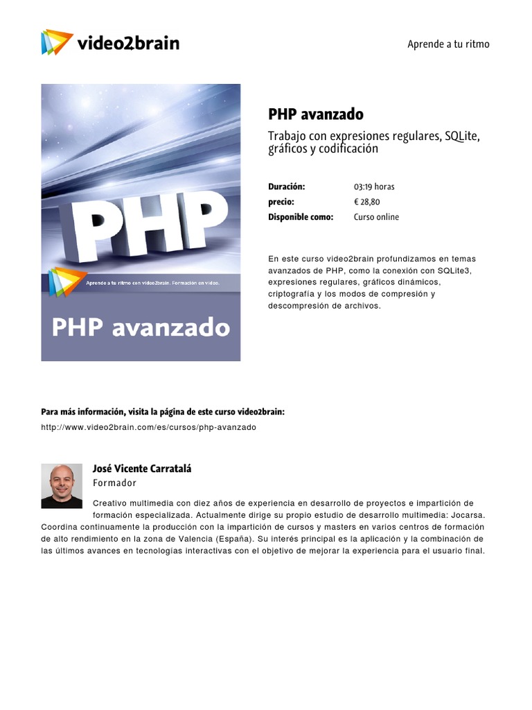 En este curso video2brain profundizamos en temas avanzados de PHP, como la conexin con SQLite3, expresiones regulares, grficos dinmicos, criptografa y los modos de compresin y descompresin de archivos.