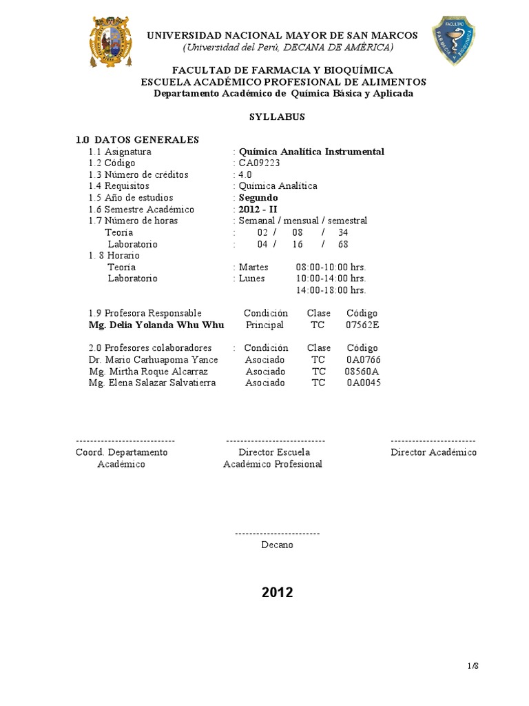 PROFESIONAL DE ALIMENTOS Departamento Acadmico de Qumica Bsica y Aplicada SYLLABUS 1.0 DATOS GENERALES 1.1 Asignatura 1.2 Cdigo 1.3 Nmero de crditos 1.4 Requisitos 1.5 Ao de estudios 1.6 Semestre Acadmico 1.7 Nmero de horas Teora Laboratorio 1. 8 Horario Teora Laboratorio 1.9 Profesora Responsable Mg. Delia Yolanda Whu Whu 2.0 Profesores colaboradores Dr. Mario Carhuapoma Yance Mg. Mirtha Roque Alcarraz Mg. Elena Salazar Salvatierra : Qumica Analtica Instrumental : CA09223 : 4.0 : Qumica Analtica : Segundo : 2012 - II : Semanal / mensual / semestral : 02 / 08 / 34 : 04 / 16 / 68 : Martes : Lunes Condicin Principal : Condicin Asociado Asociado Asociado 08:00-10:00 hrs. 10:00-14:00 hrs. 14:00-18:00 hrs. Clase TC Clase TC TC TC Cdigo 07562E Cdigo 0A0766 08560A 0A0045