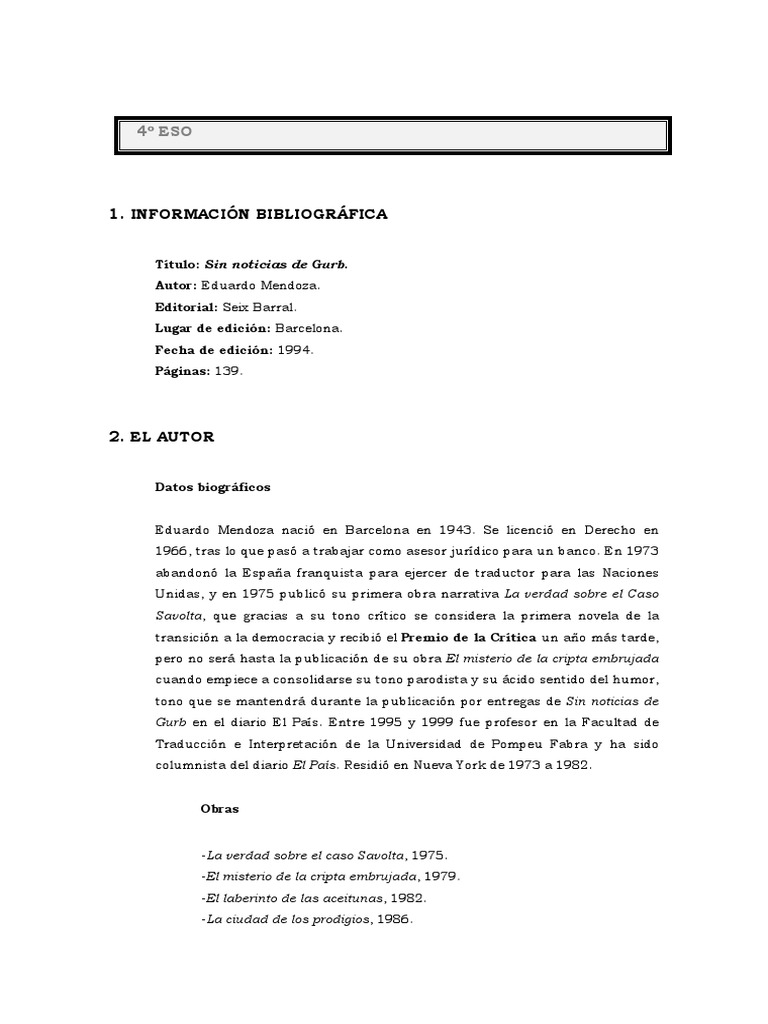 Ttulo: Sin noticias de Gurb. Autor: Eduardo Mendoza. Editorial: Seix Barral. Lugar de edicin: Barcelona. Fecha de edicin: 1994. Pginas: 139.