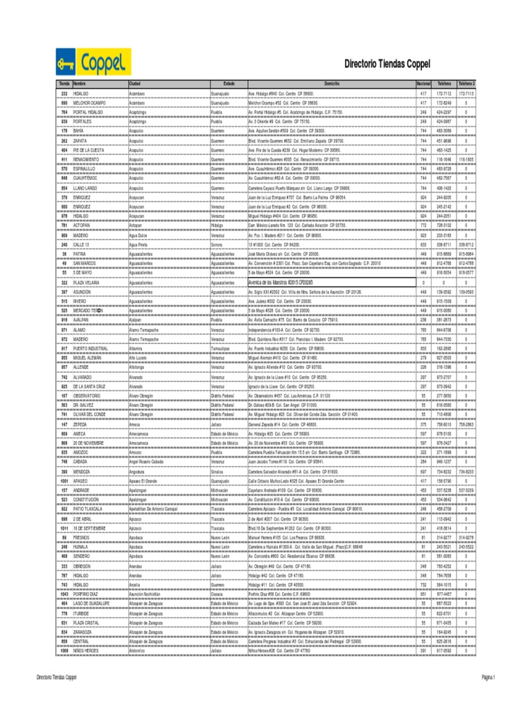 Domicilio Av. Guadalupe Victoria #148 Nte. Col. Centro CP 35000. Justo Sierra #728 Col. Centro CP 27000. Av. Ral Salinas Lozano #1300 Col. Riveras de Girasoles CP 66050. Av. Sendero Norte #1001 Col. Cerradas de Anhuac Residencial CP 66059. Jurez #400 Col. Centro CP 44100. 16 de Septiembre #325 Col. Centro CP 44100. Calzada Independencia Norte #3295 Col. Flores Magon CP 44300. Independencia #542 Col. Centro Barranquitas CP 44100. Paseo de la Arboleda #2500 Col. Residencial del Bosque CP 44510. Blvd. Jaime Torres Bodett #3090 Col. Zaus CP 44987. Presa del Tintero #653 Col. San Joaqun CP 44770. Fresno #2126 Col. El Fresno CP 44900. Av. Los ngeles #149 Col. Las conchas CP 44460. Av. Jurez #379 Col. Centro CP 44100. Industria #1551 Col. Blanco y Cuellar CP 44370. Hacienda Santiago #2295 Col. Libertad CP 44750. Calz. Independencia Norte #2955 Col. Rancho Nuevo CP 44240. Av. Manuel M. Diguez #2963 Col. Constitucin S.H. CP 45180. Loginos Cadena #2243 Col. Lomas de Polanco CP 44690. Mesa del Norte #485 Col. Belisario Domnguez CP 44320. Av. Hidalgo #444 Col. Centro CP 44100. Calle 7 #305 Col. Ferrocarril CP 44440. Ave. Jos Mara Iglesias #3150 Col. Lomas de San Eugenio CP 44720. Avenida Dr. [Link] #1003 Col. San Carlos, CP 44890 Av. Pablo Livas #7500 Col. Residencial Santa Mara CP 67190. Av. Lpez Mateos #501 Col. Las Quintas CP 67170. Av. Benito Jurez #1851 Col. El Sabino CP 67150. Carretera a Reynosa #2301 Col. 29 de Julio CP 67196. Av. Acapulco #161. Col. Los Cristales. C.P. 67117. Av. A Ruiz Cortinez #600 Col. Len XIII CP 67129. Prolong. Ruiz Cortinez Ote. #450 Col. Fracc. Valle Soleado CP 67114. Av. Benito Jurez #535 Ote. Col. Centro CP 67100. Insurgentes 22 #189 Col. Merino CP 21720. Dr. de la Torre #440 Sur Col. Centro CP 81400. Nicols Bravo #118 Ote. Col. Centro CP 81400. Alhndiga #15 Col. Centro CP 36000. Jurez #71 Col. Centro CP 36000. Juan Carrasco #311 Sur Col. Centro CP 81000. Carertera Internacional #170 Local F-2 Col. Revolucion Mexicana CP 81106 Ignacio Zaragoza #957 Col. Centro CP 81000. Rafael Buelna #105 Col. Angel Flores CP 81040. Blvd. Constitucin s/n CP 81122. Av. Jesus Garcia S/N Ote. Col. Bamoa. Ent. Benito Juarez y Miguel Hidalgo. Estacin Bamoa. Aquiles Serdn #35 Col. Centro CP 85400. Carretera Internacional #1000 Col. Las Villas CP 85440. Ave. Miguel Alemn #89 Col. Centro CP 85400. Carretera Internacional Km. 1982 s/n Col. Loma Linda CP 85420. Ave. Cuautepec #201 Col. Jorge Negrete CP 07280. Ave. Centenario #3664 Col. Pueblo de Santiago CP 07040. Av. Progreso Nacional #160 Col. Progreso Nacional CP 07600. Ave. Puerto Acapulco #17 Col. Ampliacin Casas Alemn CP 07580. Dolores Hidalgo s/n Col. San Felipe de Jess CP 07510. Av. Dolores Hidalgo #187 Col. San Felipe de Jess CP 07510. Ave. Venustiano Carranza #31 Col. Cuautepec, Barrio Bajo CP 07200. Av. Ejido #96 Col. San Felipe de Jess CP 07520. Col. Vallejo, Delegacion Gustavo A Madero CP 07870 Elas Calles #8 Col. Centro CP 83000. Vicente Guerrero #66 Col. Centro CP 83000. Av. Tecnolgico s/n Col. El Sahuaro CP 83170. Blvd Solidaridad s/n Col. El Cortijo CP 83116. Simn Bley #852 Col. Ley 57 CP 83100. Perifrico Oriente s/n Col. Perisur CP 83219. Ave. Matamoros #159 Sur Col. Centro CP 83000.
