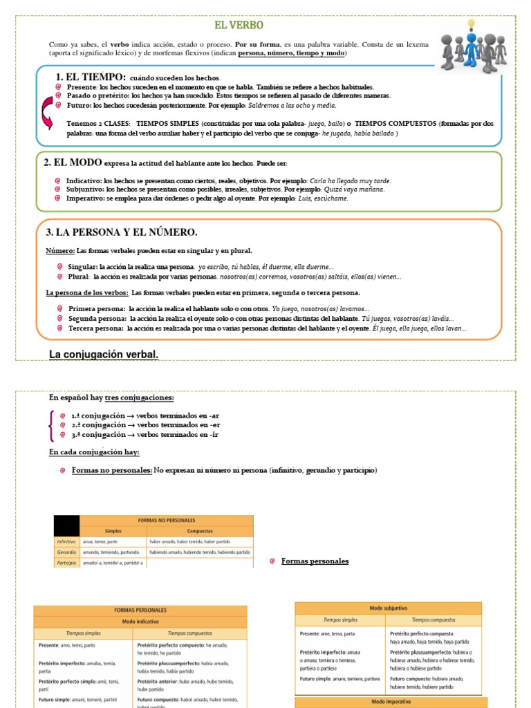 Como ya sabes, el verbo indica accin, estado o proceso. Por su forma, es una palabra variable. Consta de un lexema (aporta el significado lxico) y de morfemas flexivos (indican persona, nmero, tiempo y modo)