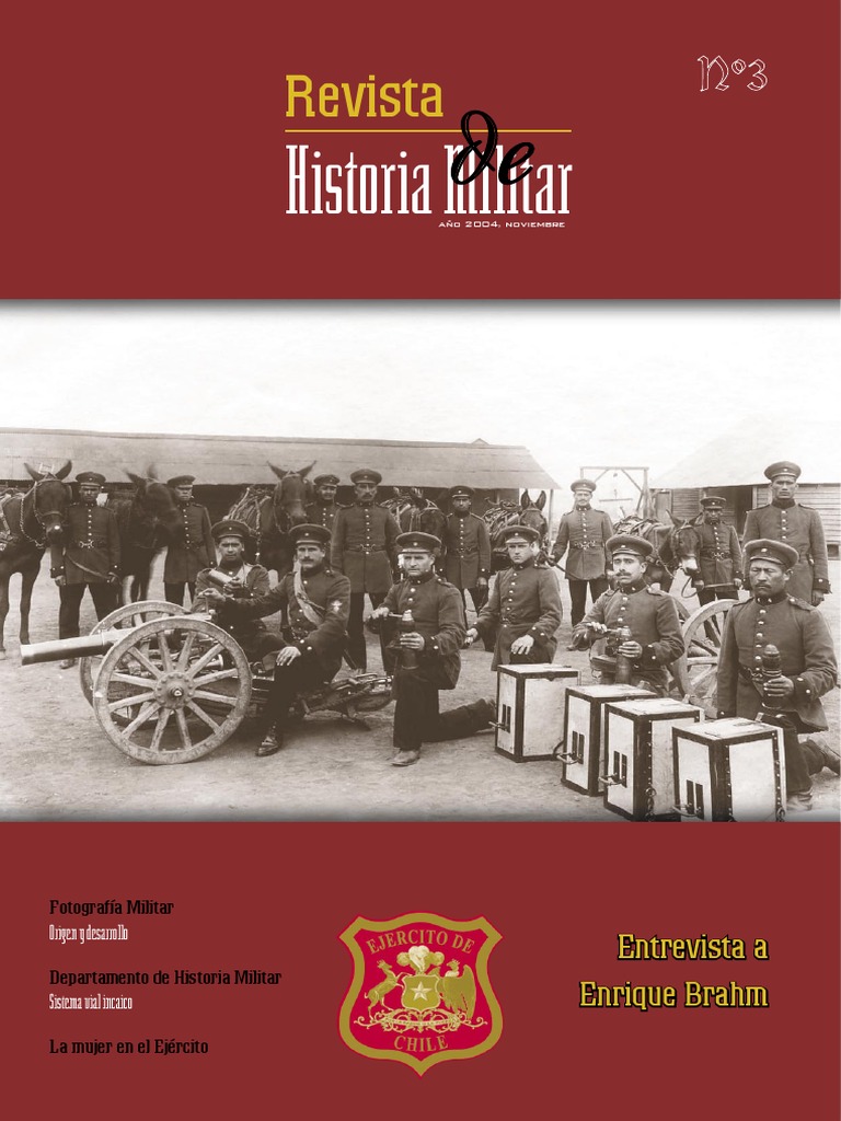 Guerra Mundial desde la movilizacin hasta la cada de la fortaleza europea. Sin embargo, la historia militar desde mediados del siglo pasado se ha inquietado por indagar otros temas derivados de las guerras, como ser; el armamento, los uniformes de los soldados y sus distintivos, los testimonios fotogrficos, las condecoraciones otorgadas por decreto supremo, las biografas personales, los sitios histricos, etc. Una temtica que atrae a cientos de investigadores comprometidos por sobrepasar lo conocido. En este detalle se sitan los asuntos de nuestra publicacin que presentamos en estos momentos. La revista de Historia Militar aparecida en noviembre de 2002 pretende abrir un espacio para publicar los trabajos de investigacin de nuestros colaboradores en conjunto con la produccin de temas del Departamento de Historia Militar, aportando con estas pginas, un sumario de textos breves, novedosos y de fcil lectura, acompaado de muestras grficas que lo hacen un documento ameno y entretenido. Por supuesto, hemos recibido opiniones que nos han permitido optimizar nuestro trabajo, intentando darle la importancia de una identidad compartida que pueda llegar a ser, con el tiempo, una coleccin. Continuando con esta lnea de trabajo, en esta revista N 3 nos hemos preocupado de mostrar algunas particularidades de la historia militar que han sido consultadas al Departamento, como ser; La mujer en el Ejrcito, Los uniformes militares, Fotografa militar, Sistema vial incaico, Museos institucionales y otros temas relacionados con el patrimonio cultural como Conservacin textil y Publicaciones militares. De esta manera, en esta oportunidad esperamos cumplir con las expectativas y requerimientos de nuestros lectores. DHM