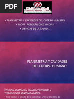 INTRODUCCIN En el estudio de la anatoma humana, la planimetra engloba las diversas formas en que puede observarse y analizarse la estructura del cuerpo mediante distintos mecanismos los cuales pueden describir la anatoma interna o externa del cuerpo as como todos las estructuras, rganos y tejidos que en l se encuentran. La posicin anatmica estndar es aquella que, por convencin, se considera adecuada para el estudio anatmico del cuerpo humano. Incluye los siguiente elementos: el cuerpo erecto (de pie), con la cabeza y cuello tambin erectos, mirando al frente, hacia adelante, con los brazos extendidos hacia abajo, a cada lado del cuerpo, con las palmas de las manos dando hacia adelante (antebrazos en supinacin), las puntas de los dedos mirando al frente, las piernas extendidas y levemente separadas (en abduccin), y los tobillos y pies igualmente extendidos (de puntillas, con la punta del pie sealando hacia el frente). En relacin a la cara, sta queda mirando al frente. En esta posicin, el vientre (palma) de cada mano es de situacin 'ventral' o anterior, mirando hacia adelante, pero la planta de cada pie (vientre) mira hacia atrs y es de posicin dorsal o posterior. Situado en una mesa de diseccin, la posicin del cuerpo se encuentra en decbito supino. Lo que antes miraba hacia adelante ahora mira hacia arriba y lo que antes miraba hacia atrs mira ahora hacia abajo. Consideremos ahora los tres ejes del espacio: