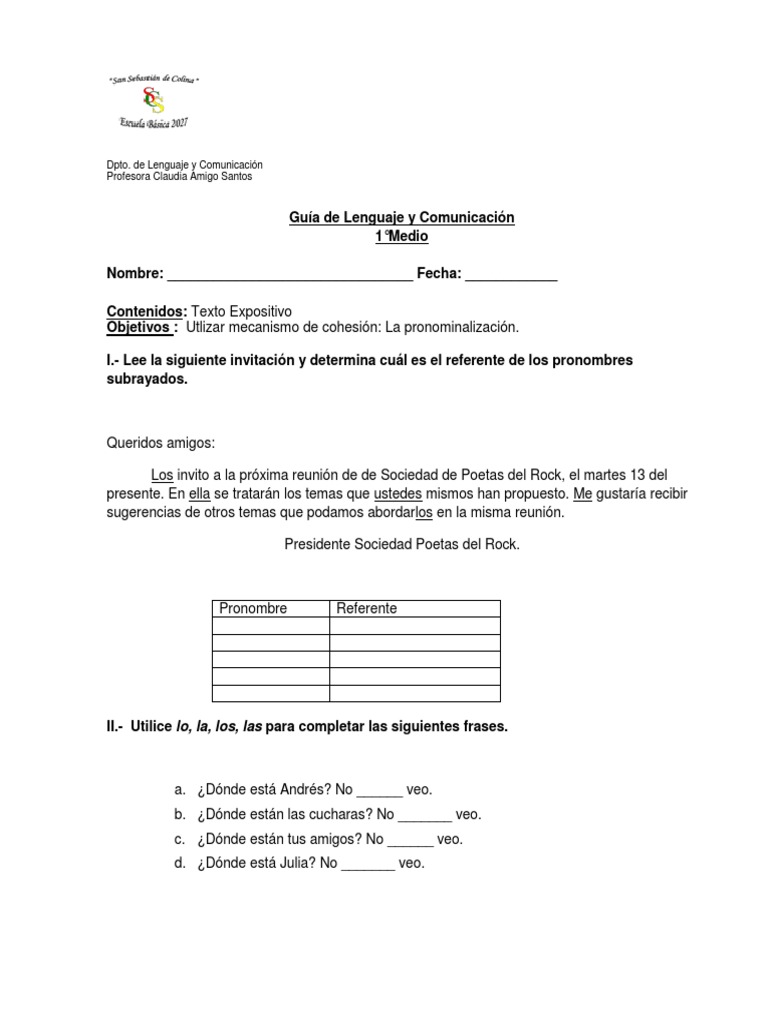 Gua de Lenguaje y Comunicacin 1Medio Nombre: ________________________________ Fecha: ____________ Contenidos: Texto Expositivo Objetivos : Utlizar mecanismo de cohesin: La pronominalizacin. I.- Lee la siguiente invitacin y determina cul es el referente de los pronombres subrayados.