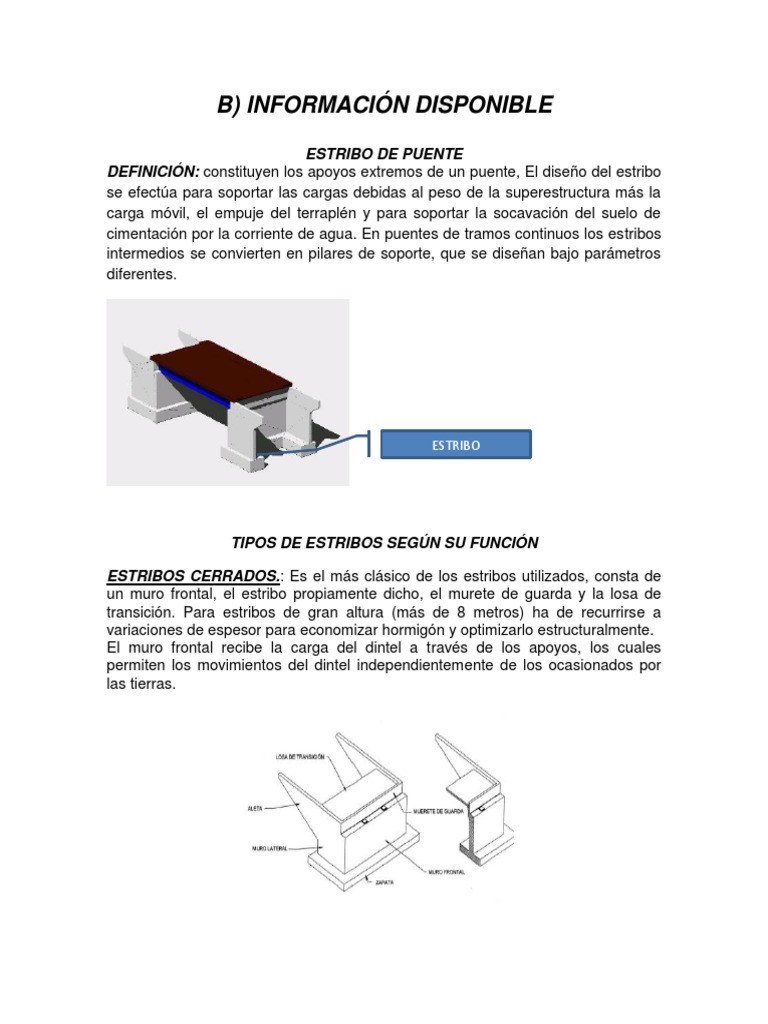 ESTRIBO DE PUENTE DEFINICIN: constituyen los apoyos extremos de un puente, El diseo del estribo se efecta para soportar las cargas debidas al peso de la superestructura ms la carga mvil, el empuje del terrapln y para soportar la socavacin del suelo de cimentacin por la corriente de agua. En puentes de tramos continuos los estribos intermedios se convierten en pilares de soporte, que se disean bajo parmetros diferentes.