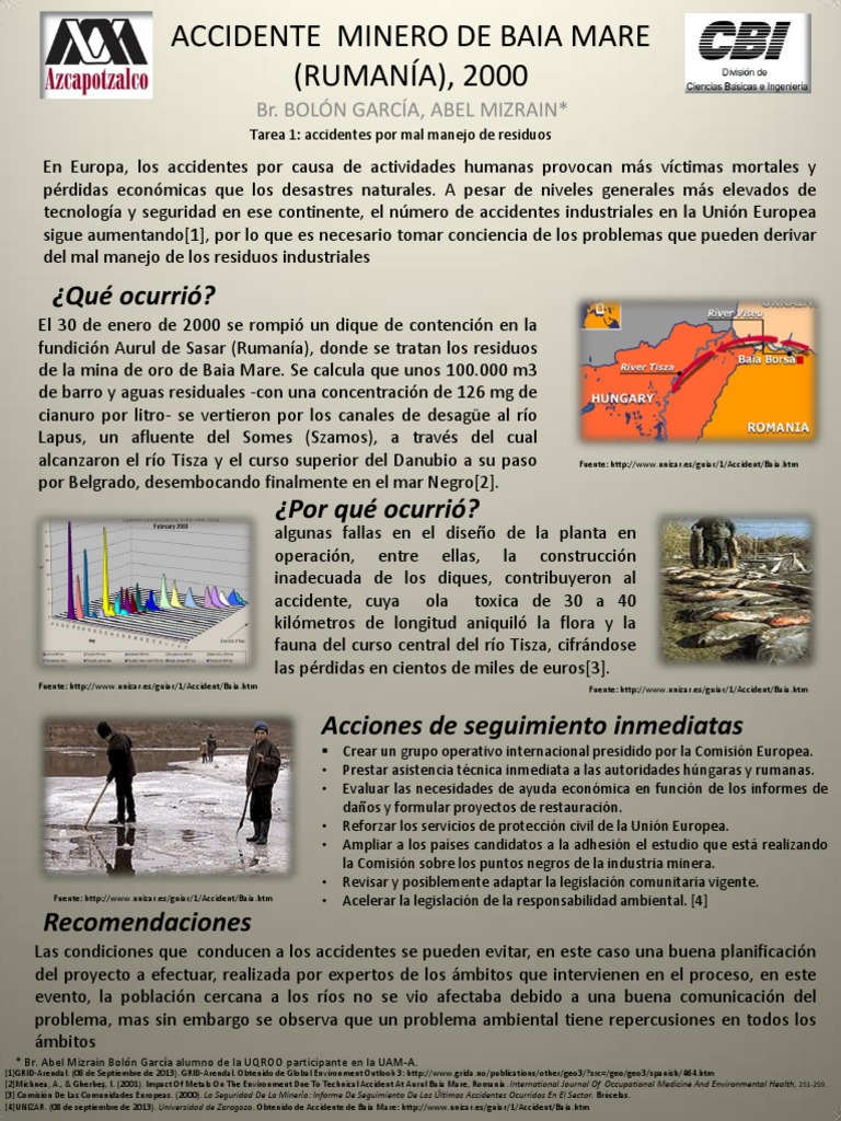 [1]GRID-Arendal. (08 de Septiembre de 2013). GRID-Arendal. Obtenido de Global Environment Outlook 3: http://www.grida.no/publications/other/geo3/?src=/geo/geo3/spanish/464.htm [2]Michnea, A., & Gherhe, I. (2001). Impact Of Metals On The Environment Due To Technical Accident At Aurul Baia Mare, Romania. International Journal Of Occupational Medicine And Environmental Health, 251-259. [3] Comisin De Las Comunidades Europeas. (2000). La Seguridad De La Minera: Informe De Seguimiento De Los ltimos Accidentes Ocurridos En El Sector. Brcelas. [4]UNIZAR. (08 de septiembre de 2013). Universidad de Zaragoza. Obtenido de Accidente de Baia Mare: http://www.unizar.es/guiar/1/Accident/Baia.htm