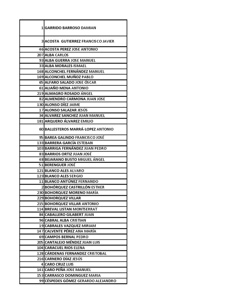 1 GARRIDO BARROSO DAMIAN 3 ACOSTA GUTIERREZ FRANCISCO JAVIER 46 207 93 33 168 169 65 61 219 82 130 17 34 181 ACOSTA PEREZ