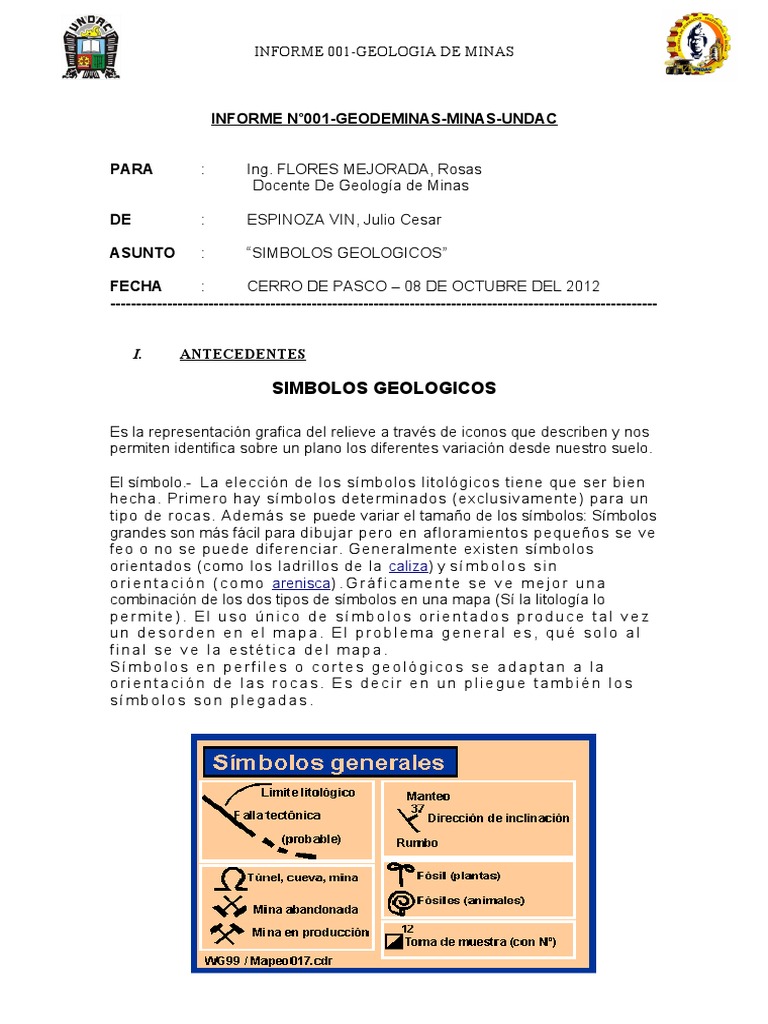INFORME N001-GEODEMINAS-MINAS-UNDAC PARA DE ASUNTO : : : Ing. FLORES MEJORADA, Rosas Docente De Geologa de Minas ESPINOZA VIN, Julio Cesar SIMBOLOS GEOLOGICOS