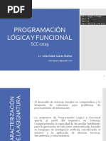 Temario: 1.-Introduccin. 2.-Programacin Lgica: Clasulas de Horn, Hechos, Consultas, Reglas, Ejemplos. 3.-Prolog: Trminos Prolog, rbol de Bsqueda Prolog, Nmeros Naturales, Listas, rboles. 4.-Teora: Resolucin, Resolvente, Derivacin, Refutacin, rboles SLD. 4.-Programacin en Prolog: Terminacin, Soluciones, Metapredicados, Corte, Negacin, Lectura y Escritura. 5.-Introduccin a la Programacin Lgico-Funcional.