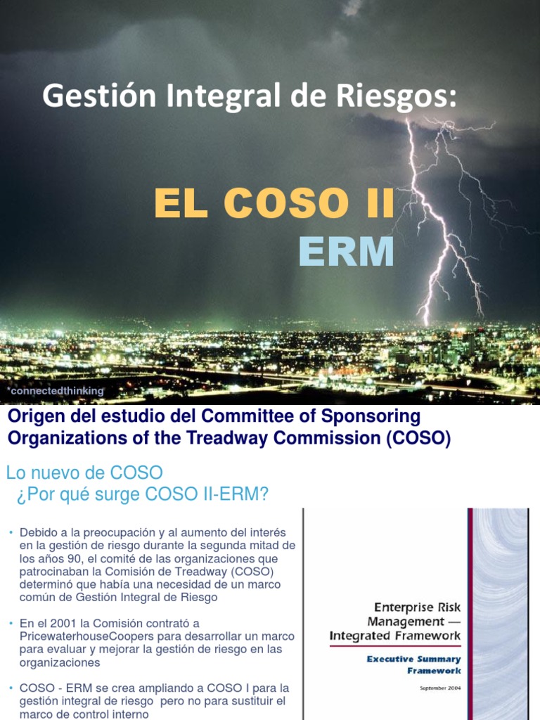 Debido a la preocupacin y al aumento del inters en la gestin de riesgo durante la segunda mitad de los aos 90, el comit de las organizaciones que patrocinaban la Comisin de Treadway (COSO) determin que haba una necesidad de un marco comn de Gestin Integral de Riesgo En el 2001 la Comisin contrat a PricewaterhouseCoopers para desarrollar un marco para evaluar y mejorar la gestin de riesgo en las organizaciones COSO - ERM se crea ampliando a COSO I para la gestin integral de riesgo pero no para sustituir el marco de control interno En Septiembre de 2004 se public el estudio ERM (Enterprise Risk Management) Integrated Framework
