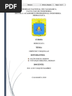 h. Comente y haga conclusiones en base a los grficos presentados, manifestando entre otras cosas las razones de la concordancia o discrepancia con los valores predichos por la teora. ...................................................................................... 22 i. Presentar una relacin de coeficientes de descarga, de velocidad, de contraccin, de prdidas de carga tericas, para diversos tipos de orificios, boquillas y tubos cortos. ................................................................................................................ 23 j. 16) Mencionar la aplicacin prctica de tales coeficientes, por ejemplo para el diseo de qu tipo de obras se utilizan. .. 24 BIBLIOGRAFIA: ..................................................................................................................................................................... 24