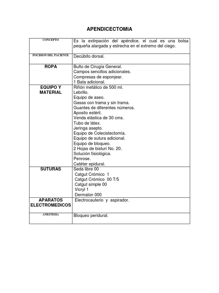 Es la extirpacin del apndice, el cual es una bolsa pequea alargada y estrecha en el extremo del ciego. Decbito dorsal. Bulto de Ciruga General. Campos sencillos adicionales. Compresas de esponjear. 1 Bata adicional. Rin metlico de 500 ml. Lebrillo. Equipo de aseo. Gasas con trama y sin trama. Guantes de diferentes nmeros. Aposito estril. Venda elstica de 30 cms. Tubo de ltex. Jeringa asepto. Equipo de Colecistectoma. Equipo de sutura adicional. Equipo de bloqueo. 2 Hojas de bistur No. 20. Solucin fisiolgica. Penrose. Catter epidural. Seda libre 00 Catgut Crmico 1 Catgut Crmico 00 T/5 Catgut simple 00 Vicryl 1 Dermalon 000 Electrocauterio y aspirador.