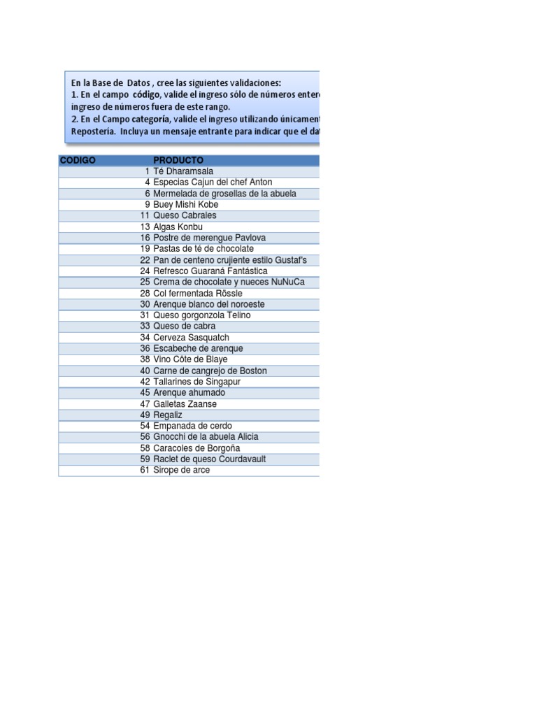 CDIGO 1 4 6 9 11 13 16 19 22 24 25 28 30 31 33 34 36 38 40 42 45 47 49 54 56 58 59 61 PRODUCTO T Dharamsala Especias Cajun del chef Anton Mermelada de grosellas de la abuela Buey Mishi Kobe Queso Cabrales Algas Konbu Postre de merengue Pavlova Pastas de t de chocolate Pan de centeno crujiente estilo Gustaf's Refresco Guaran Fantstica Crema de chocolate y nueces NuNuCa Col fermentada Rssle Arenque blanco del noroeste Queso gorgonzola Telino Queso de cabra Cerveza Sasquatch Escabeche de arenque Vino Cte de Blaye Carne de cangrejo de Boston Tallarines de Singapur Arenque ahumado Galletas Zaanse Regaliz Empanada de cerdo Gnocchi de la abuela Alicia Caracoles de Borgoa Raclet de queso Courdavault Sirope de arce