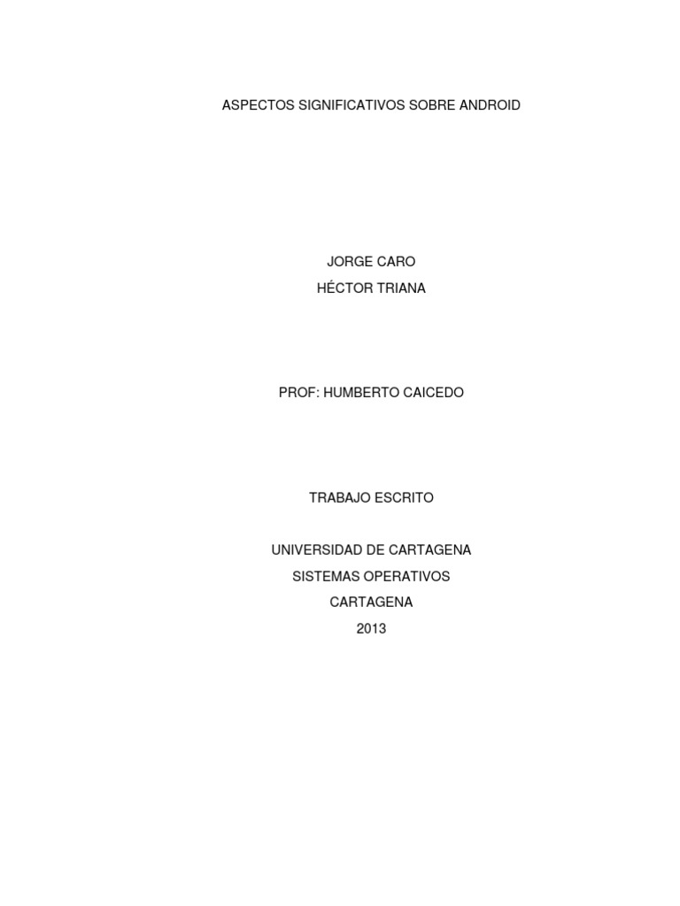 Este trabajo es hecho con el fin de abordar aspectos sobresalientes del sistema operativo Android: qu es?, su historia, sus confrontaciones con Apple y Microsoft por la hegemona en el mercado, y como ha ayudado a desarrollar el talento humano en las ciencias computacionales, as como para su entretenimiento personal y cmo este evoluciona para estar a la altura de los tiempos.