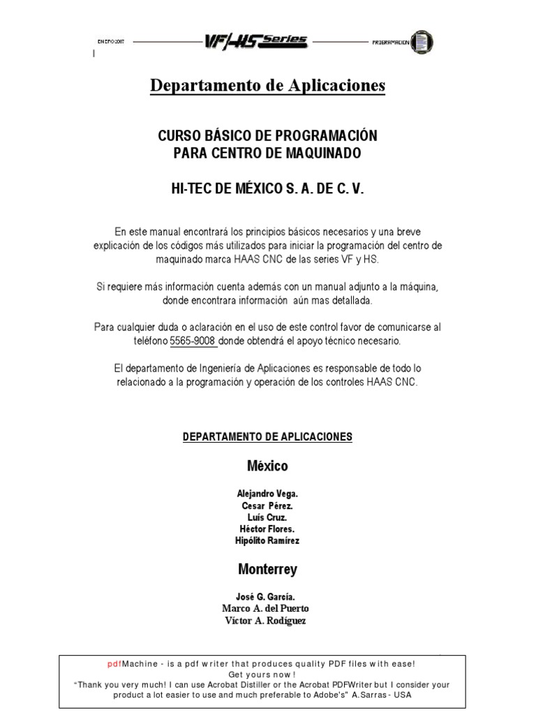 En este manual encontrar los principios bsicos necesarios y una breve explicacin de los cdigos ms utilizados para iniciar la programacin del centro de maquinado marca HAAS CNC de las series VF y HS. Si requiere ms informacin cuenta adems con un manual adjunto a la mquina, donde encontrara informacin an mas detallada. Para cualquier duda o aclaracin en el uso de este control favor de comunicarse al telfono 5565-9008 donde obtendr el apoyo tcnico necesario. El departamento de Ingeniera de Aplicaciones es responsable de todo lo relacionado a la programacin y operacin de los controles HAAS CNC.